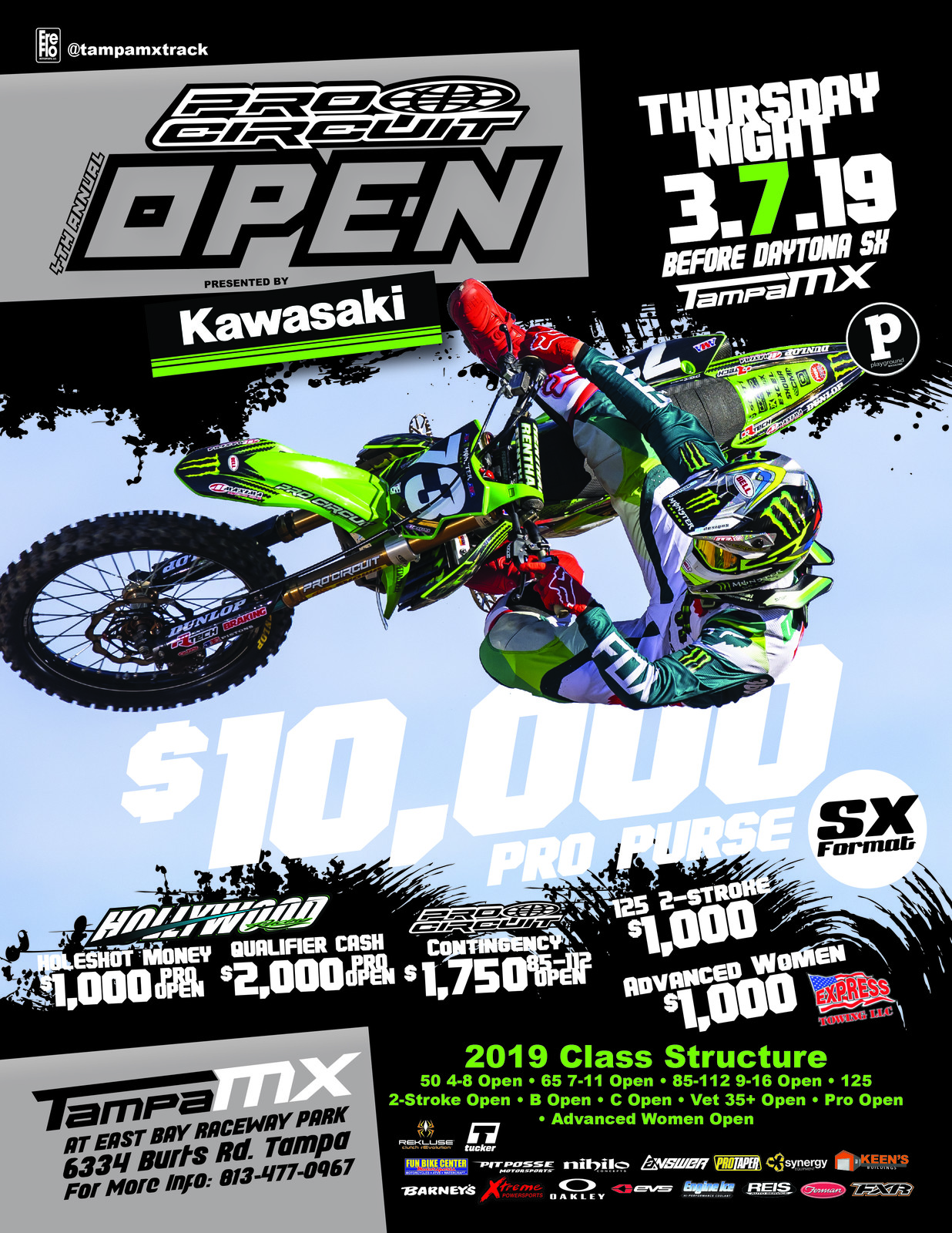 The 4th Annual Pro Circuit Open Presented By Kawasaki will roll into Tampa MX Thursday Night March 7, 2019 (Before Daytona SX). Gates Open at 3:00p Practice 5:00p Racing 7:00p