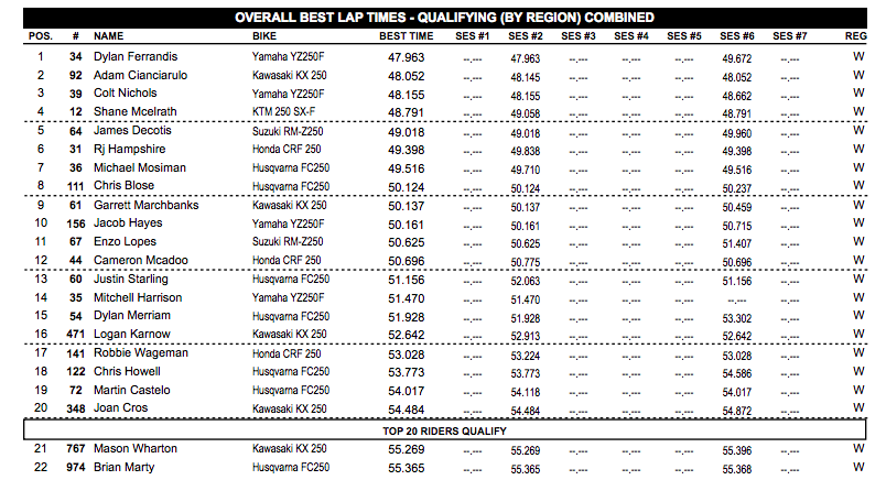 Adam Cianciarulo was fastest in the second West Region qualifying session with a 48.052. Colt Nichols and Shane McElrath followed.