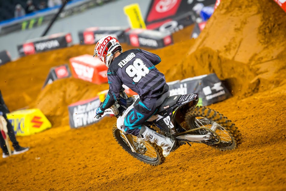 JMC Motorsports Husqvarna's Wilson Fleming went down hard in 250SX East Region heat race on Saturday night in Atlanta, which caused the race to be red flagged and a staggered restart.