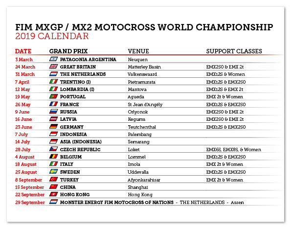 The inaugural MXGP of China has been moved to September 14-15 and will now be round 18 of the championship. The MXGP of Hong Kong, the final round of the 2019 FIM Motocross World Championship, will take place a week later.