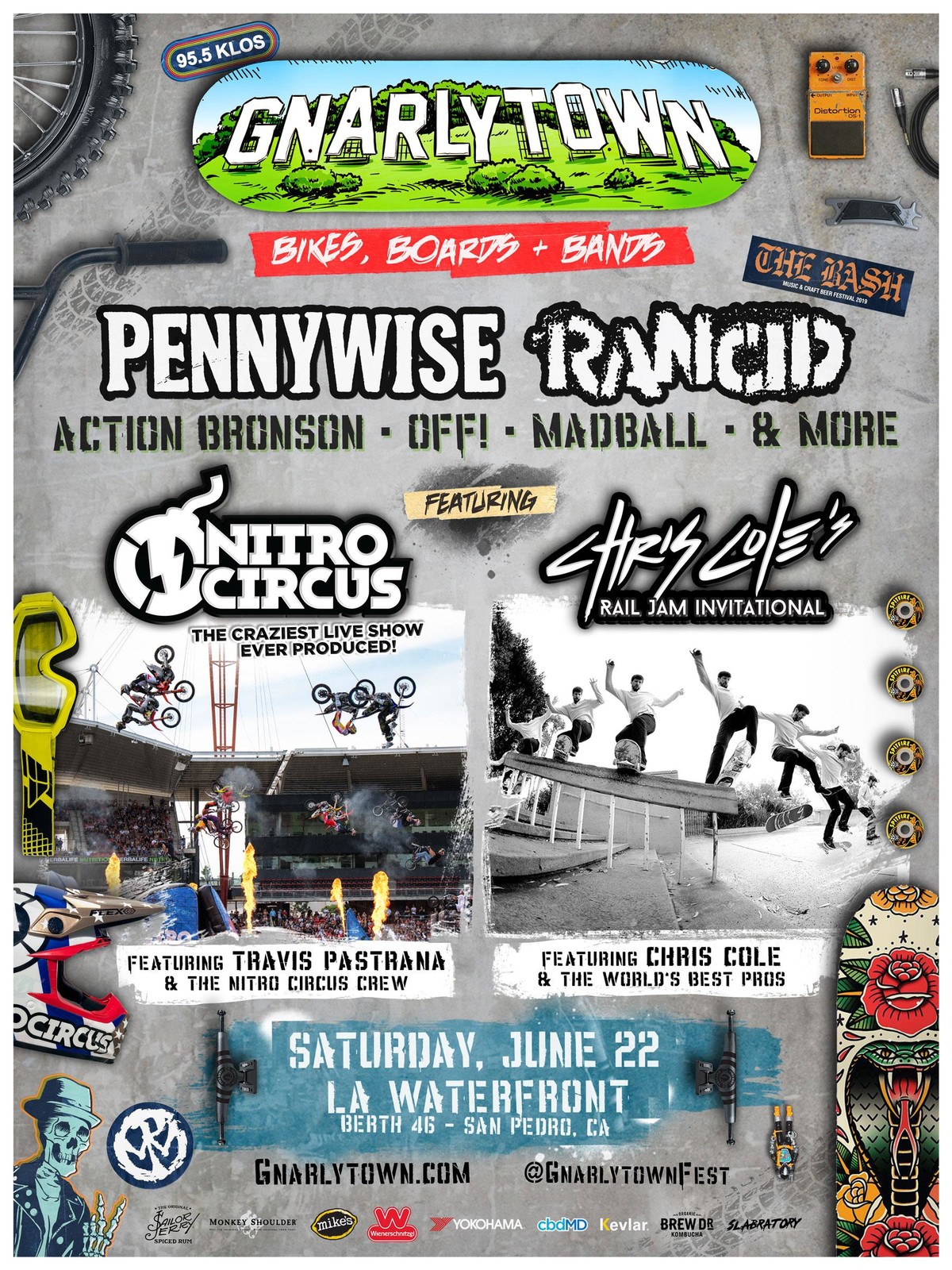 KLOS Presents Gnarlytown: Bikes, Boards & Bands kicks off this summer in Southern California with the ultimate mashup of action sports, punk rock, and craft beer tasting. Coming to scenic LA Waterfront Berth 46 at the Port of Los Angeles in San Pedro, CA on Saturday, June 22, this new, fun, one-of-a-kind event unites the vital energy and DIY spirit of action sports and punk rock: a dynamic mix that has infused SoCal youth culture for decades. Throughout the festival the daredevils of Nitro Circus, featuring Travis Pastrana and the Nitro Circus crew, will get pulses racing with their thrilling live show, while a collection of the world’s top skate athletes will show their skills in a free jam format during Chris Cole’s Rail Jam Invitational. On the concert stage, a lineup of legendary punk rock bands and other top music acts including Pennywise, Rancid, Action Bronson, Off!, and Madball will deliver amped up performances. For thirsty fans 21 and over, the event will also feature craft beer tastings (with purchase of a tasting pass) from some of the finest breweries in Southern California and beyond, including Rancid’s own collaboration with Ska Brewing, Brewstomper.