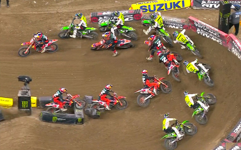 And I’m not really sure how to answer that. Of course he’s talking about that spectacular and insane moment in last weekend’s main event where Webb cross-rutted while trying to catch Eli Tomac, landed on the Tuff Blox on the inside of the left-handed hairpin, somehow saved it, then passed Tomac when Eli seemed to lay up on the outside, probably thinking Webb was going to hit him. Afterward Webb of course described it as “an RC move” in reference (and deference) to the GOAT himself, and he was right—and he would have been right if he called it “the full Bob Hannah!” I’m not sure it was “cutting the track” as much as landing off the side of it, nor am I sure what else he could have done—turning around certainly wasn’t an option, though waiting to pass Tomac might have been, but Eli went up high on his own, so that just adds another layer of uncertainty on just what this really was, a cut or a near-crash, or both.