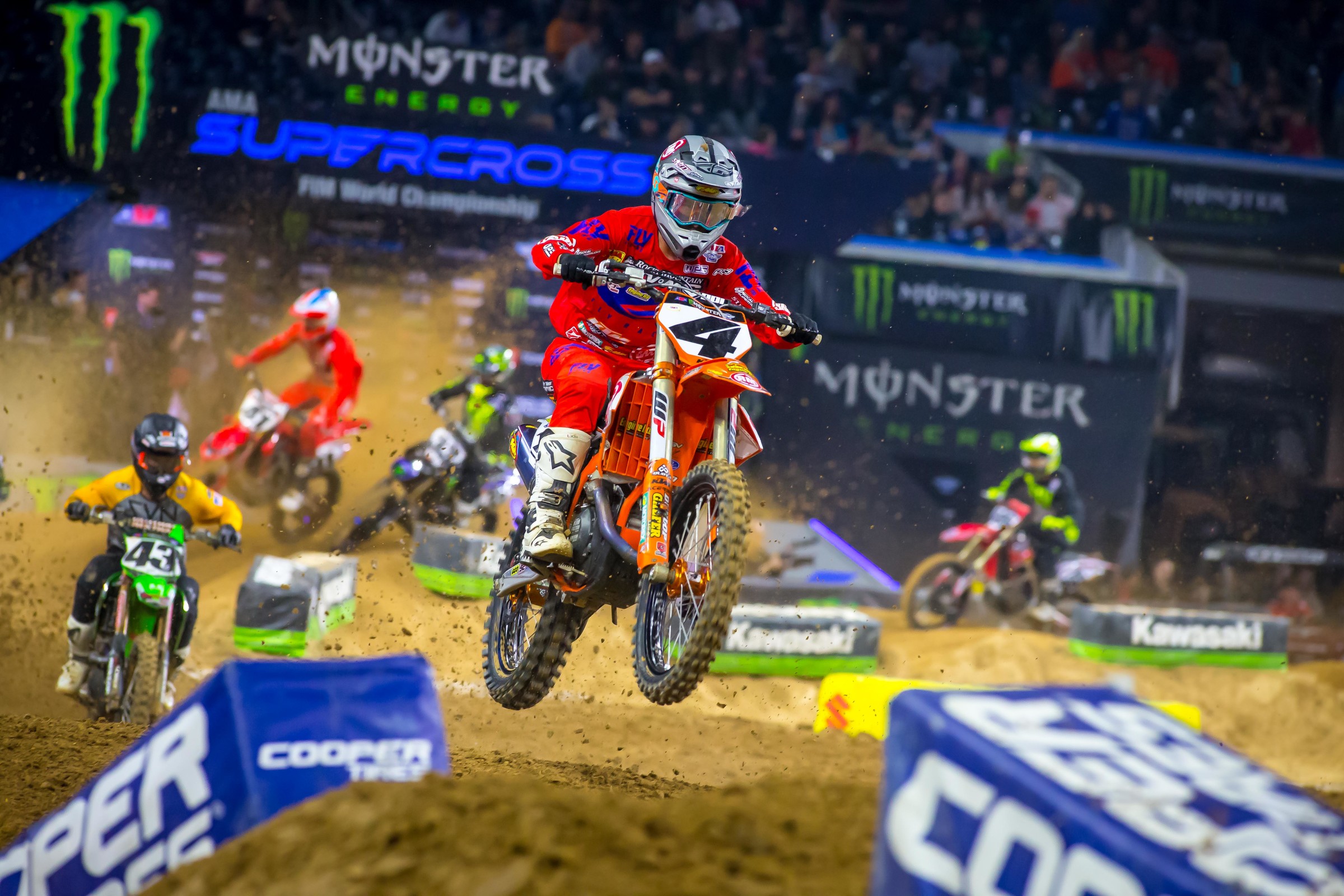 I know you people are talking about the Marvin Musquin and Cooper Webb stuff that happened in the first race of the night. I get it, they’re teammates, they’re one and two in points, and they’re training partners, so the potential for drama is there. We hadn’t seen much happen all year, but that all changed in Houston. In the press conference, Coop admitted that his emotions got the best of him.