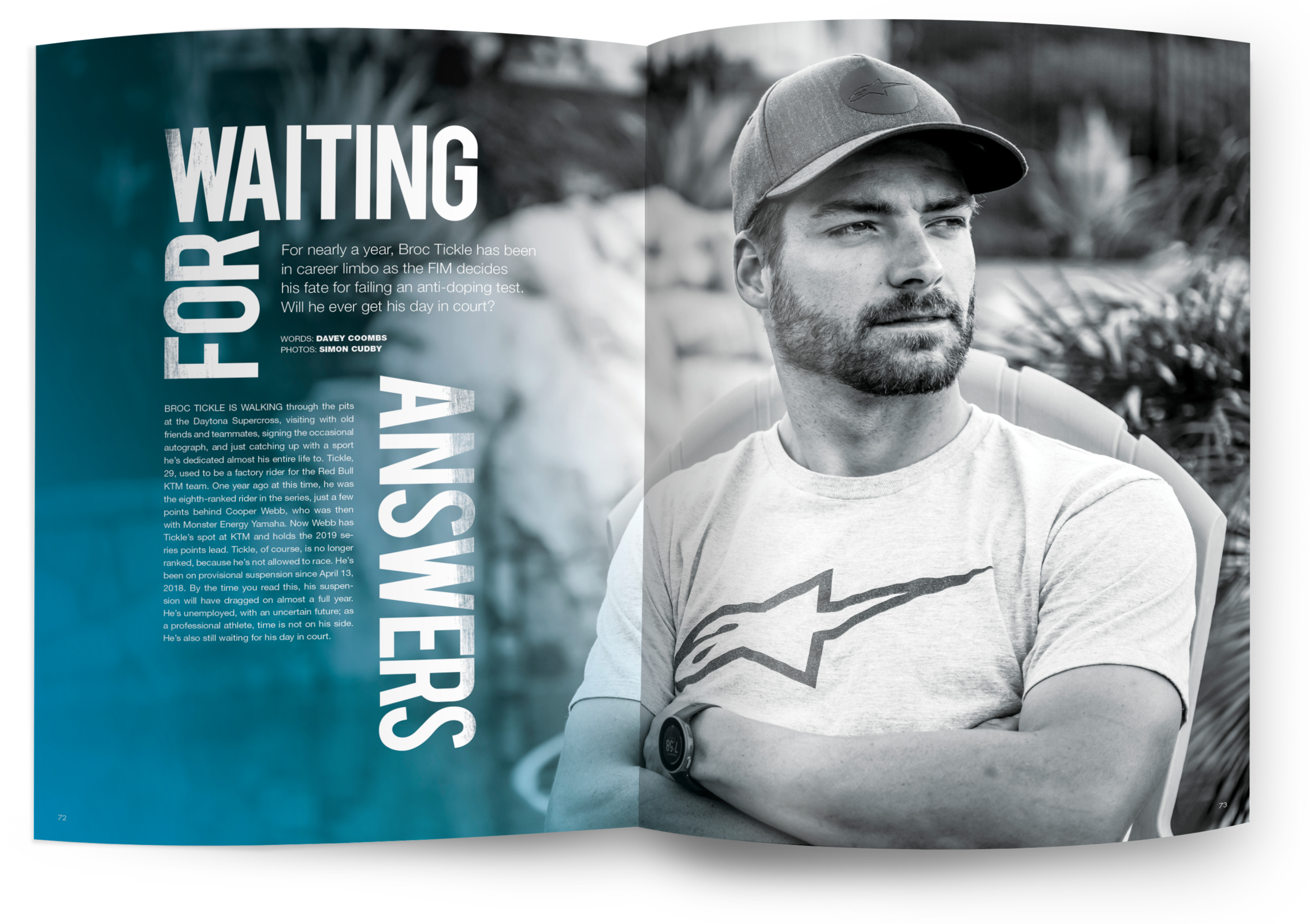 Broc Tickle has spent the last year in career limbo waiting for the FIM to decide his fate in the wake of a failed anti-doping test. Will he ever get his day in court? Read Waiting for Answers starting on page 72.