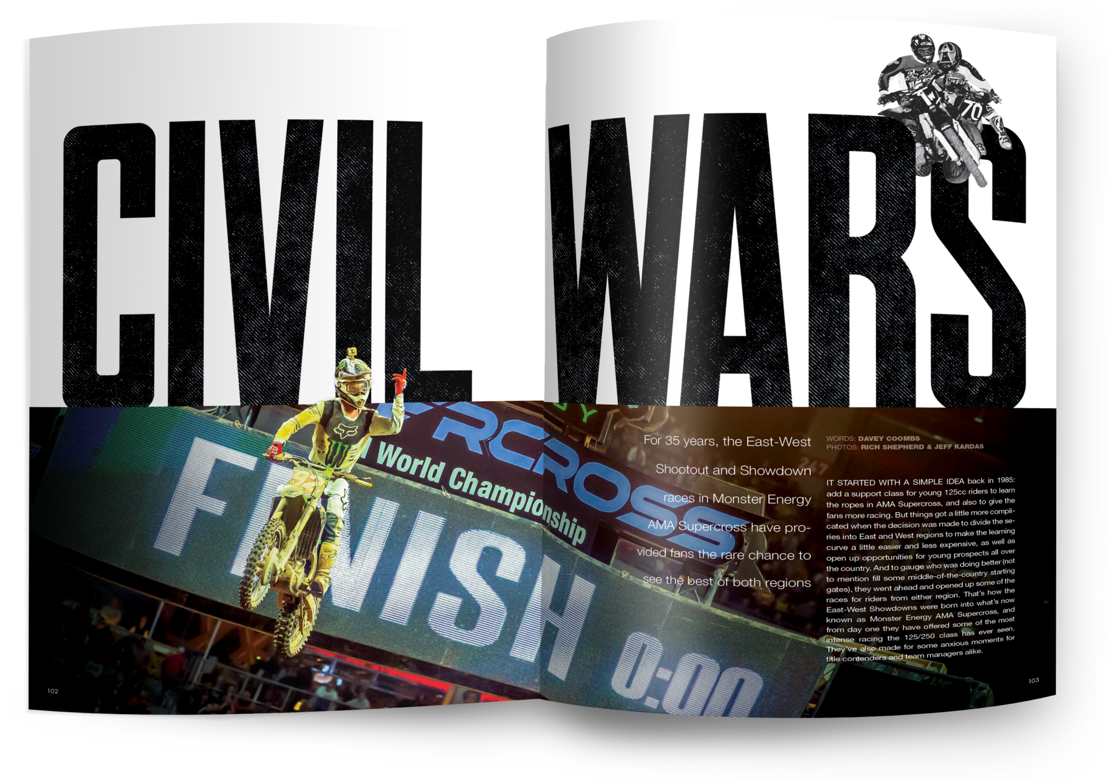 For 35 years, smaller-displacement riders from the East and West Regions of AMA Supercross have done battle in Shootout/Showdown races. How did it all start? Find out in Civil Wars starting on page 102.