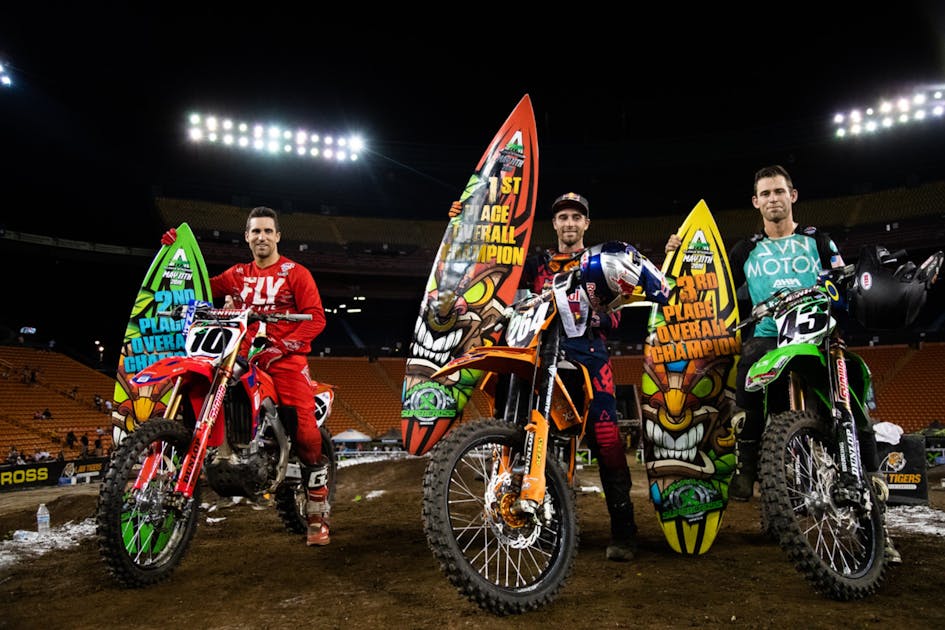 About that crowd: about 15,000 fans showed up, and while Aloha Stadium holds much more, the building is clearly designed to amplify sound, so it felt like 50,000 when the cheers came. The event featured some freestyle (including Ronnie Mac) and the John Desoto Cup for local Hawaiian riders. Desoto, by the way, is 71 years old but even swung a leg over his Honda 450 and did a lap of the track in opening ceremonies! There aren’t any supercross tracks on any of the Hawaiian islands, by the way, so this was a new challenge for the locals. Yes you had the standard crashes, but no one got terribly hurt, and the crowd loved the island versus island des Nations style format. The home island, Oahu, won it, which drew more cheers. Nineteen-year-old Donovan Canionero is generally considered the fastest Hawaiian rider right now, and he lived up to that by winning all three races.