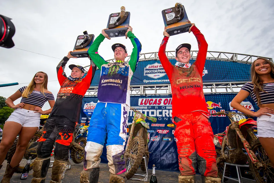 Hometown favorite Alex Martin put his JGR/Yoshimura Suzuki to a popular podium with second overall, and GEICO Honda's Hunter Lawrence won the first moto and took third overall with a 1-6.