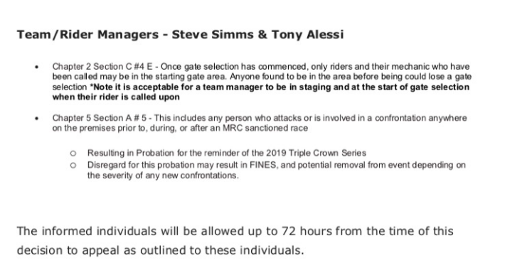 Once things got calmed down there in the staging area for the podium Phil again let Mike know that he wasn’t happy and uttered threats towards Mike. Nicoletti didn’t make it physical at all but it wasn’t a good look for him, despite him having a right to be upset at Mike’s riding. The key words? At one point, Phil, while pointing at Mike, screamed, "I will F&*$ing kill you!"