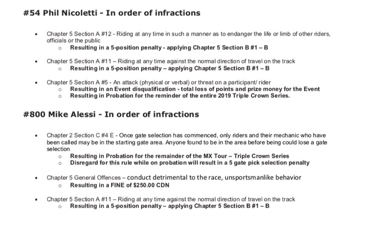 At the end of the day, Alessi got fined $250 bucks for conduct detrimental to the race (when trying to hold Phil up) docked five spots for riding backwards on the track, and put on probation (the team hasn’t decided yet whether to appeal). Nicoletti lost spots for also riding backwards on the track, riding in an unsafe manner and of course, losing his mind on Mike afterwards with the cameras rolling. All of Phil’s infractions ended up getting him disqualified for the day and ruins his title chances. He came into the race tied for the points lead, but left with zero points on the day (he would have DNFed the first moto anyway with the mechanical, but losing second-place points in moto two is very costly).