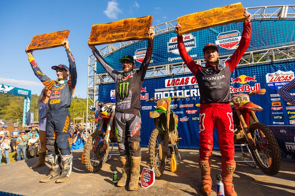 Honda HRC's Ken Roczen returned to the overall podium for the first time since the High Point National in June via 2-3 moto finishes and Red Bull KTM's Marvin Musquin rounded out the overall podium via 5-2 moto finishes.