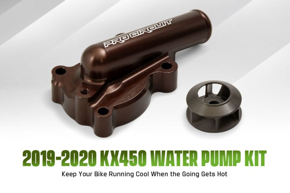 CORONA, CA—A crucial engine component necessary for superior engine performance, the 2019-2020 KX450 Water Pump Kit is designed to keep your engine running cool when the racing heats up. The Pro Circuit water pump provides increased pumping capacity and reduced cavitation for maximum cooling efficiency. The water pump kit for the new KX450 is an essential race item that has been rigorously tested for peak performance and is forged from CNC-machined aircraft quality aluminum and anodized for a factory look.