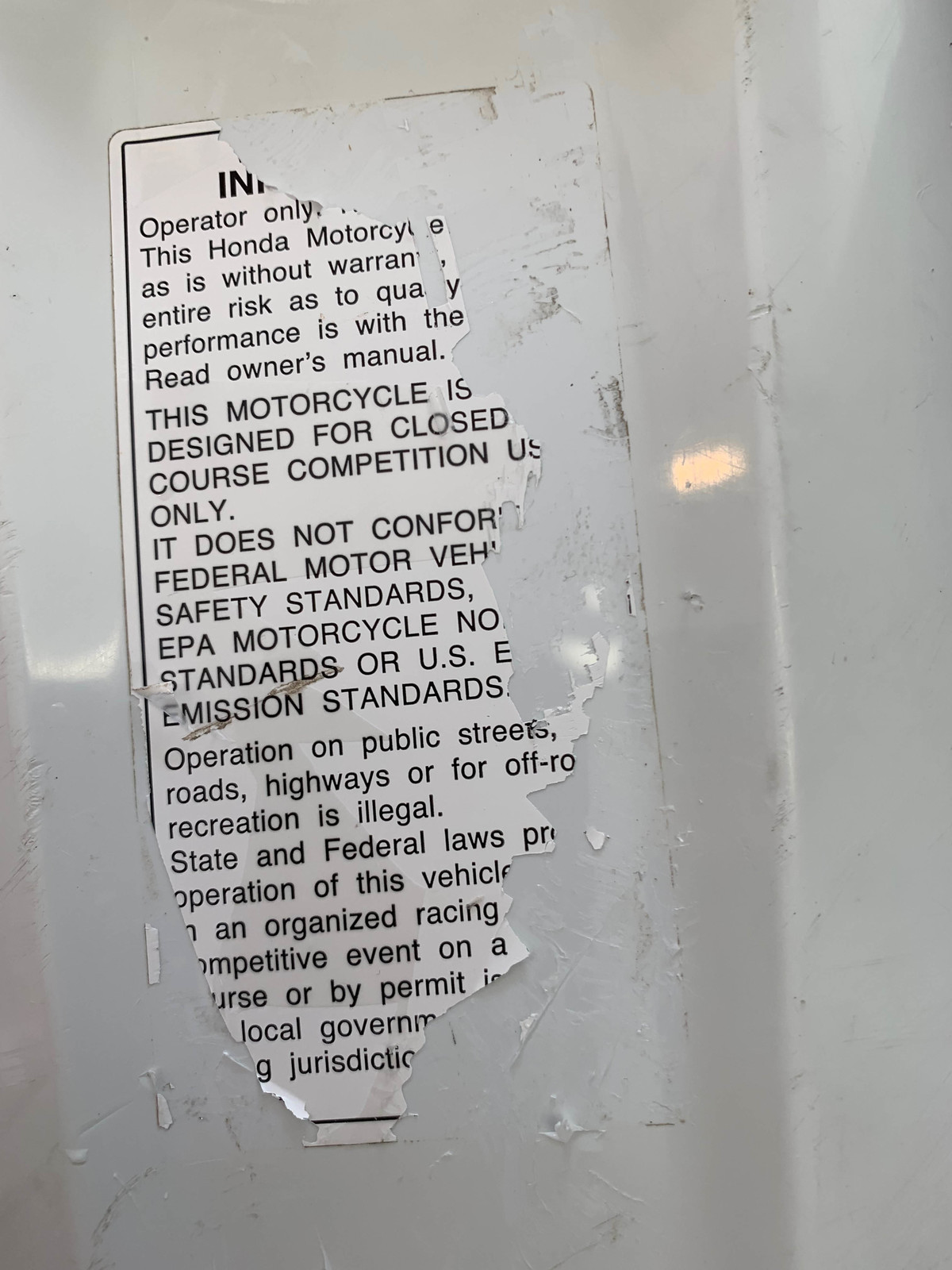 I’ve finally realized that I’m never going to be a factory racer or win a plastic trophy from my local track. Therefore, I figured at the very least I can make my bike look stylish while getting passed. I took the initiative to remove the warning sticker on my rear fender to begin the transformation. After an hour of peeling the sticker off a tiny piece at a time, I started to worry that maybe the government that mandated the sticker was secretly tipped off that a removal was in progress. I started to panic, thinking up excuses I could tell the Feds when they showed up to my house. After much contemplation, I decided to blame it on my wife. Ping, do you think that’s a dick move or self-preservation?