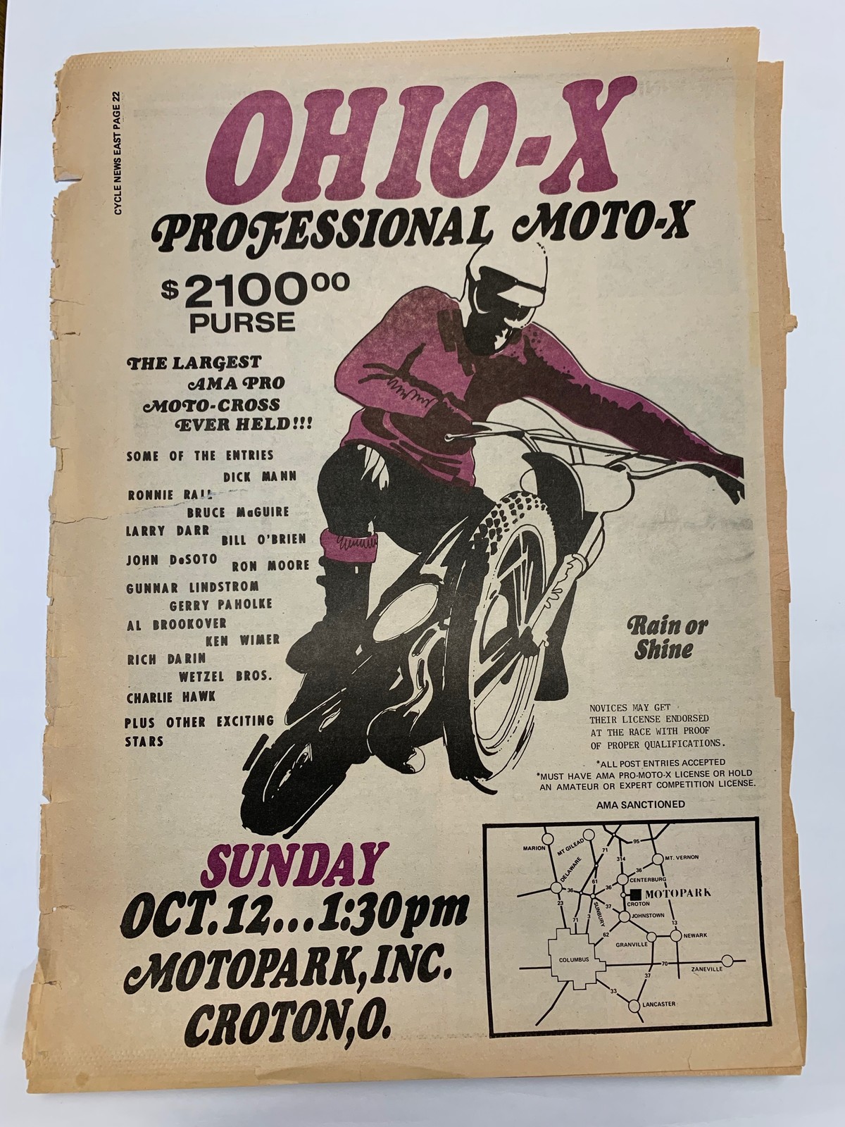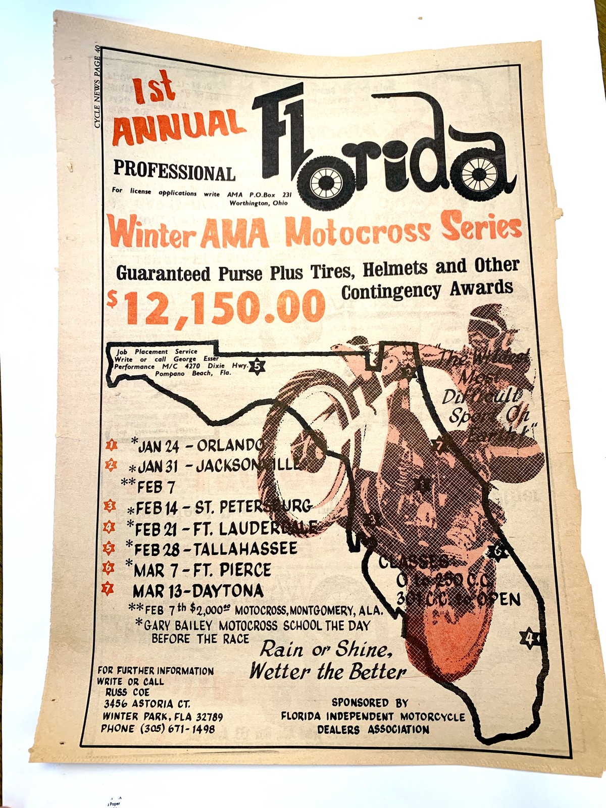 He also started a motorcycling newspaper called State Motorcycle News that would eventually become Cycle News East. And that's what was in the poster tube that John Born sent to me: a 1967 edition of one of John Penton's State Motorcycle News publications! He also added a couple of cut-out pages from later issues that mentioned some very early races, including an early pro "moto-cross" race at Motopark in Croton, Ohio, as well as an ad for the 1971 Florida Winter-AMA Series, which included the first Daytona Motocross race. (That race will turn 50 next year, so you can expect to be hearing a lot more on that in the future.)