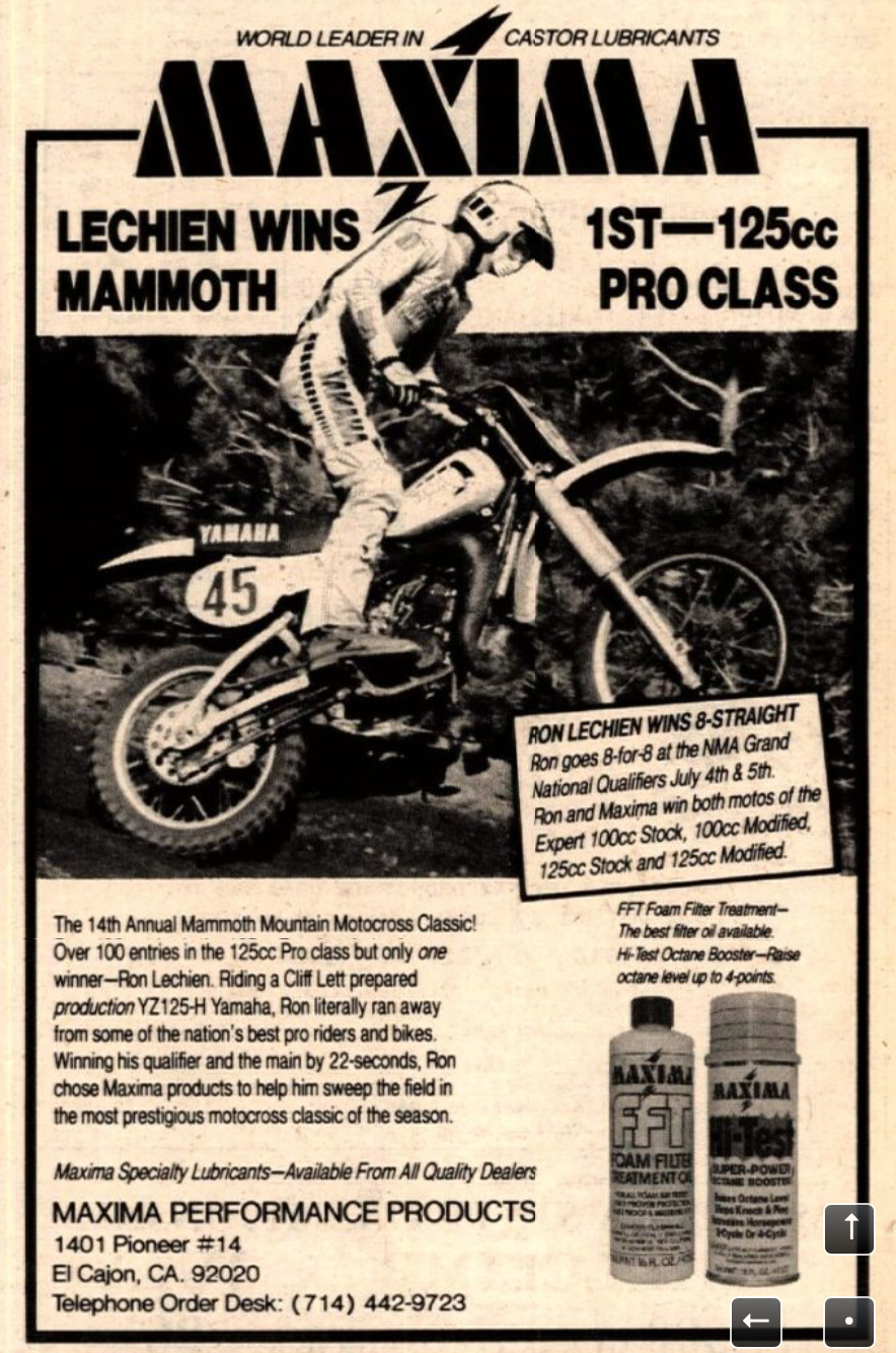 1981 Mammoth Mountain Motocross: At the ripe, old age of 14, Ron Lechien puts himself on the national motocross map by winning the one 125cc pro race he's allowed to enter, the non-sanctioned Mammoth Mountain Classic. Riding a Yamaha YZ125, Lechien tops a field of veterans that includes USGP winner Marty Moates, SoCal legend "Radical" Ron Turner, Mike Tripes (Marty's brother), and more.