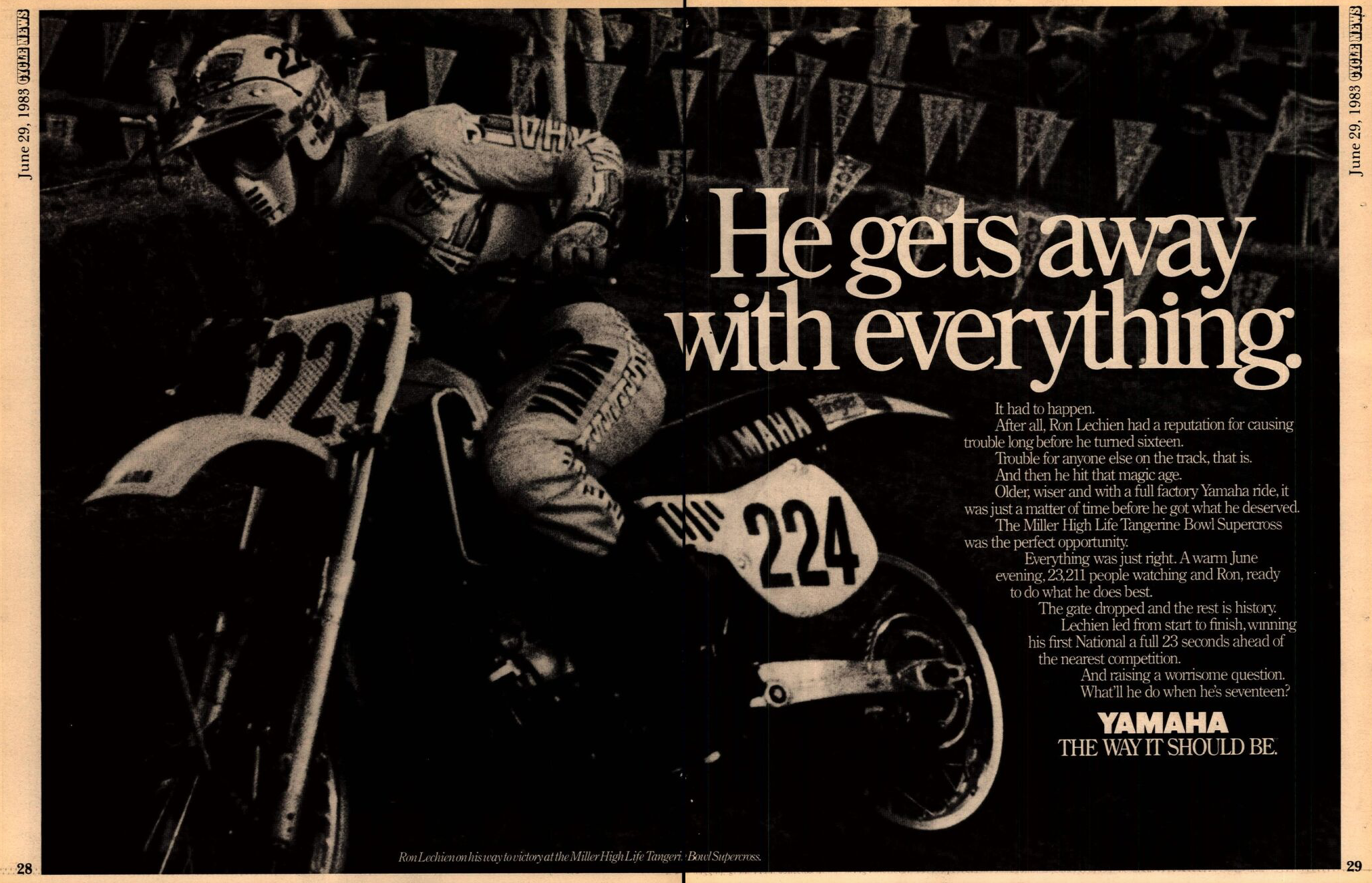 1983 Orlando Supercross: With no 125cc class in AMA Supercross, Yamaha wanted to wait for as long as possible before letting their talented teenaged prodigy loose on a real supercross track. They waited until March and the motocross-like Daytona Supercross track to send him out, and he responded with a ninth-place finish in his first professional race. By June, when the 125 Nationals were up and running and AMA Supercross overlapped from time to time, he was often getting top tens in SX. Then at the Orlando Citrus Bowl on June 11, 1983, Lechien had the first epic race of his professional career, winning the main event on his Keith McCarty-tuned Yamaha over a couple of guys he was getting used to racing with outdoors, fellow 125cc specialists Johnny O'Mara of Team Honda and three-time 125 National Champ Mark Barnett of Team Suzuki. In doing so, he became the second-youngest premier-class winner ever in AMA Supercross, with Marty Tripes the one to ever win at a younger age. And here's thing: he was 23 seconds ahead of runner-up O'Mara.