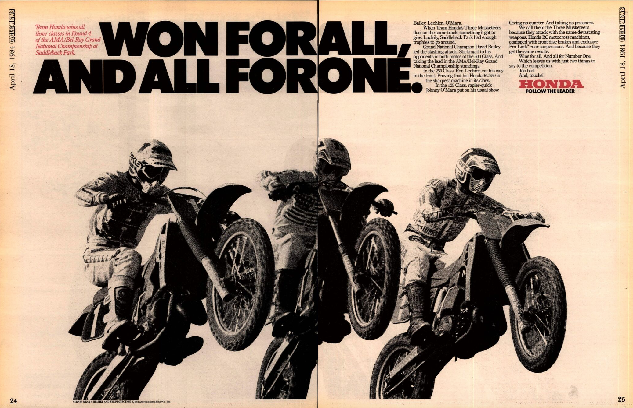 1984 Saddleback: In what turns out to be the last-ever pro race at the mecca of Southern California motocross, Lechien wins the 250 class at the April 1, 1984, Saddleback National. Having switched to Honda during the off-season, Lechien was dispatched to the 250 class since the team already had defending champion Johnny O'Mara in the 125 class. Honda would end up sweeping that last Saddleback National, as O'Mara won the 125 class and David Bailey topped the 500s. This would be the first of Lechien's three 250 National wins that summer, but the title would fall to his rival and former Yamaha teammate Rick Johnson.