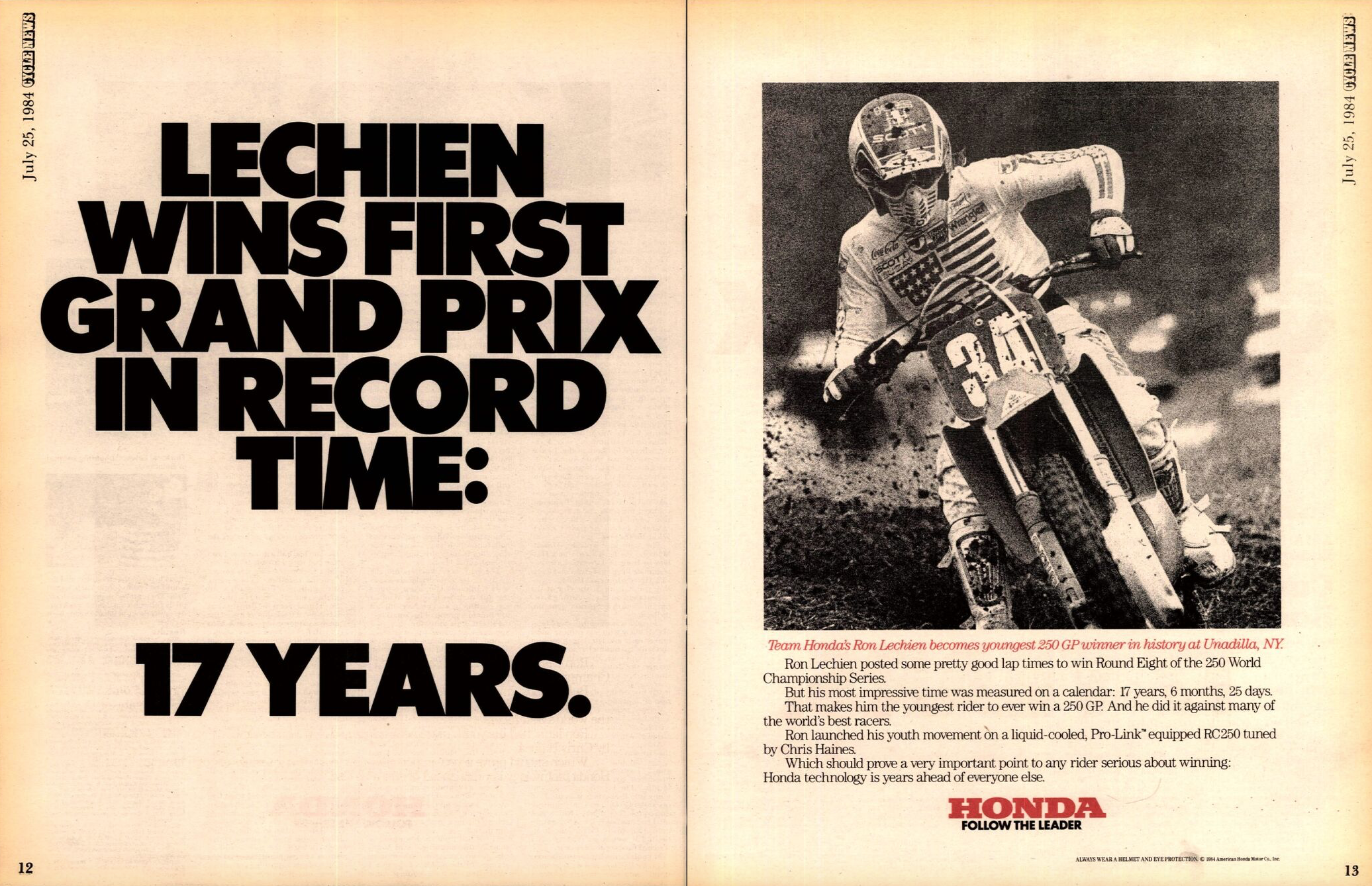1984 Unadilla 250 U.S. Grand Prix: Still just 17 years old, Lechien rides into the FIM record books as the youngest winner ever in the 250cc FIM World Motocross Championships, winning the U.S. Grand Prix at Unadilla. It was Lechien's first visit ever to Unadilla in Upstate New York, as well as his first Grand Prix.