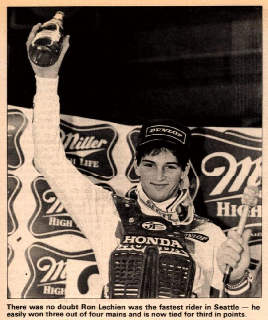 1985 AMA 125 Nationals: Lechien's most dominant summer of all was 1985 when Lechien, armed with a potent HRC Honda RC125, ruled the 125 Nationals. He lost two races to bad luck—a seized engine at the Gatorback opener and a flat front tire at High Point—but then won every other race he entered. It wasn't really a fair fight as Lechien was the only rider in the class with truly works equipment, as the AMA was in the process of introducing their Production Rule for 1986. By that point, Lechien would no longer be with Honda, but the bike he helped develop would win the next four AMA 125 National Championships with riders who were not quite as talented as Lechien: Micky Dymond ('86-'87), George Holland ('88), and rookie Mike Kiedrowski ('89). It's also worth noting that Lechien also missed the last 125 National of 1985 as he had already clinched the title and the Honda brass moved him up into the 250 class for the Washougal finale in a vain effort to try to help Johnny O'Mara beat Kawasaki's Jeff Ward.