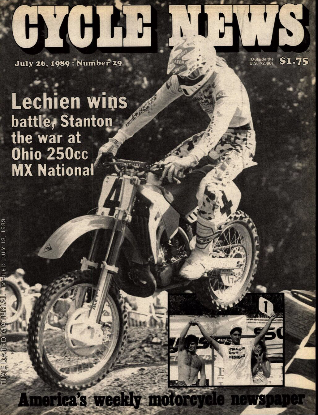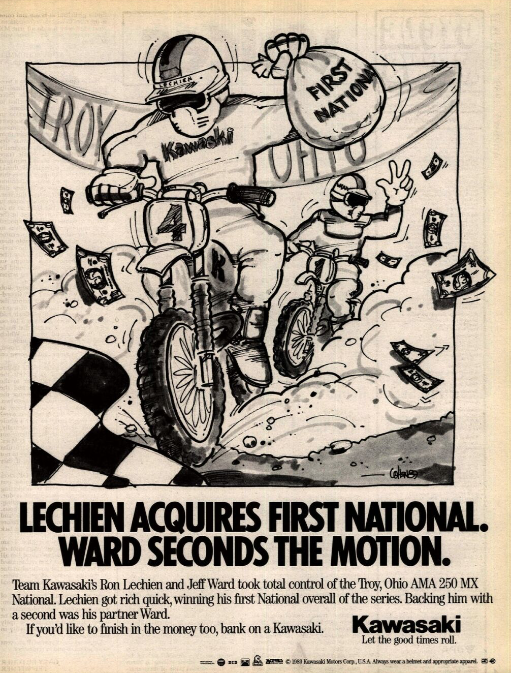 1989 Kenworthy's 250 National: In what will turn out to be the last win of his career, Lechien wins the series-ending 250 National at Kenworthy's in Troy, Ohio, leading his Kawasaki teammate Jeff Ward. A little over a month later Lechien will crash at the Steel City 500 National and suffer a broken femur, the first major injury of his career. He will be out for a year, returning on a privateer TUF Racing Kawasaki.