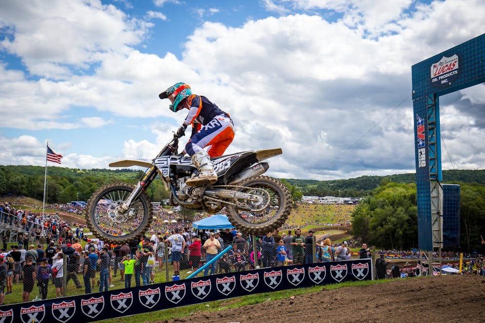 Thanks. I don’t know where it came from! I didn’t have any expectations coming into the weekend. Like I said, I have a stock KTM 450 with my suspension on it. It hasn’t been serviced in 40 hours, but it works fine. Everything was great. I had my little brother there. He didn’t even have a backpack going to the line. Barely had a pit board. I didn’t have numbers until the night of the race because I screwed up, I got the wrong color graphics. I didn’t even realize I needed a different color. I don’t know why it just slipped my mind. When I asked Briar for a new set of graphics for Ironman, I ordered them and I forgot to even mention that I was racing the 450 Class. I raced a 250 at Unadilla. Changing the graphics colors slipped my mind. When you got to arrange all this stuff and try to get ready, sometimes the details get blurred.