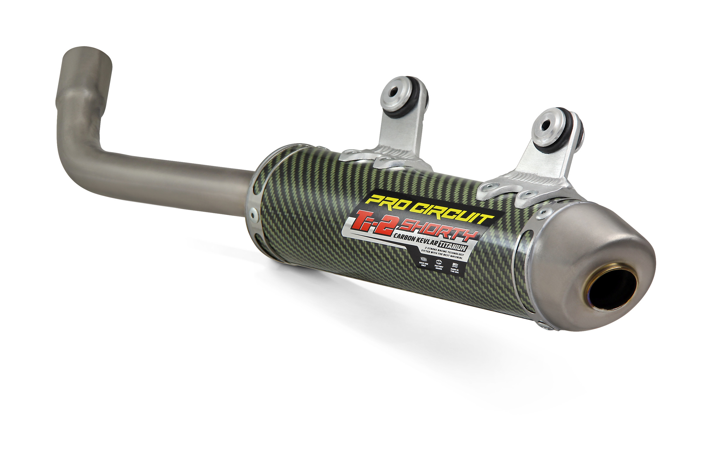 The Ti-2 Shorty Carbon Kevlar/Titanium Silencer is the latest piece of racing technology offered by Pro Circuit and is guaranteed to be a favorite for most two-stroke riders. The Ti-2 is similar to the popular R-304 silencer except it is constructed with a carbon Kevlar shell, titanium tubing and titanium end-cap. The titanium and carbon Kevlar construction offers the "factory" look and appearance while reducing weight. The Ti-2 is for closed-course racing only.