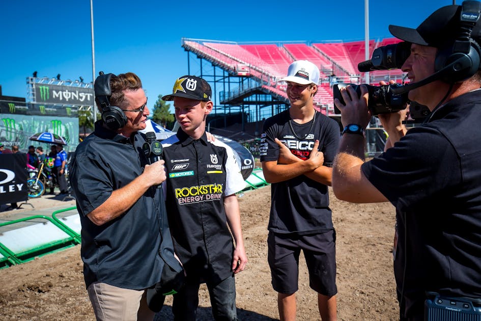 The good thing is, some of these kids are funny! Evan Ferry, son of 1997 125 SX East Regional Champion Tim Ferry, won the Supermini race in his debut ride for Rockstar Energy Drink Husqvarna. Jett Lawrence, of GEICO Honda, won the SX Futures race. Both swept their motos to carry 1-1 scores.