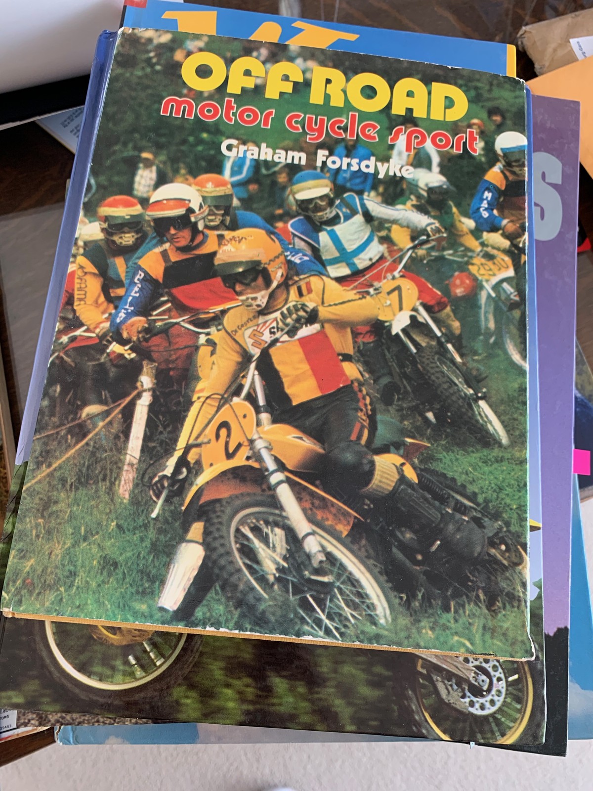 Off Road Motor Cycle Sport by Graham Forsdyke is a British book from the ‘70s with some amazing photography of the Grand Prix heroes of the day: Roger DeCoster, Heikki Mikkola, Adolf Weil, and more. It's something of a middle-school library book, but the cover jacket alone featuring The Man on what looks like Donnington Park at the 1973 Trophee Des Nations, is worth whatever the cover price is! (It was 2.50 Pounds when it came out in 1974.)