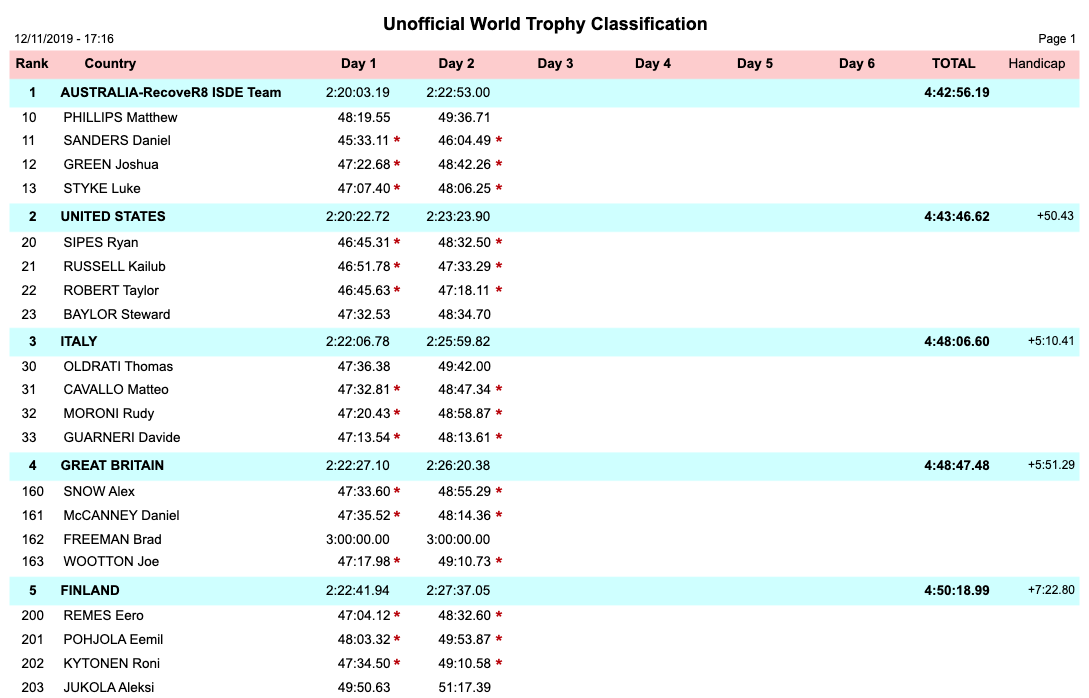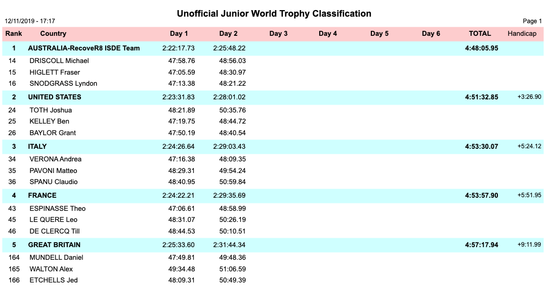 Great Britain end day two forty seconds behind Italy in fourth, but extend their advantage over fifth-placed Finland to one-minute and thirty seconds. Spain complete the top-six thanks to the strong efforts of Josep Garcia (KTM). Currently second outright to Sanders and leading the Enduro 1 category he is enjoying his FIM ISDE return.