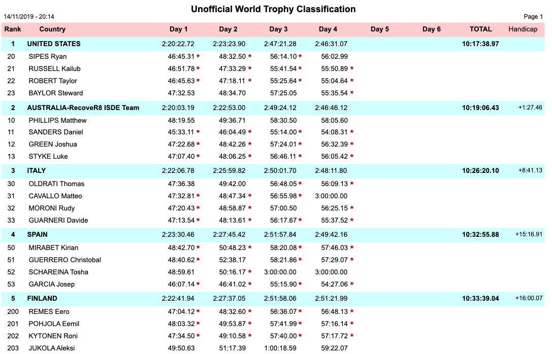 Great Britain—in what is their debut FIM ISDE—are on course to claim a memorable result. Sitting second overall, they head Germany in third by just over three minutes. Second fastest on day four, Germany will be motivated to bridge that gap to Great Britain and have two more days of racing to do so. Three minutes behind Germany in fourth, Spain are not out of the running for a podium result either, while Sweden complete the top-five.