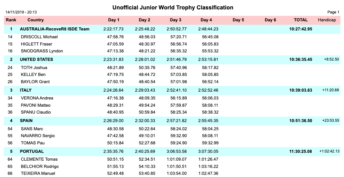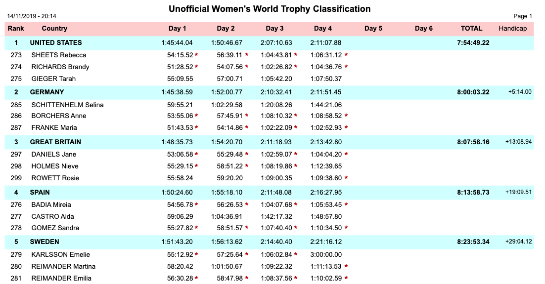 Team Australia still leads the Junior Trophy overall standings, with Team USA in second place but on the Women's Trophy side; Team Australia saw their second rider withdraw from competition in as many days. At the end of the day, Team USA's Women's team has a five-minute, 14-second advantage over second-place Team Germany
