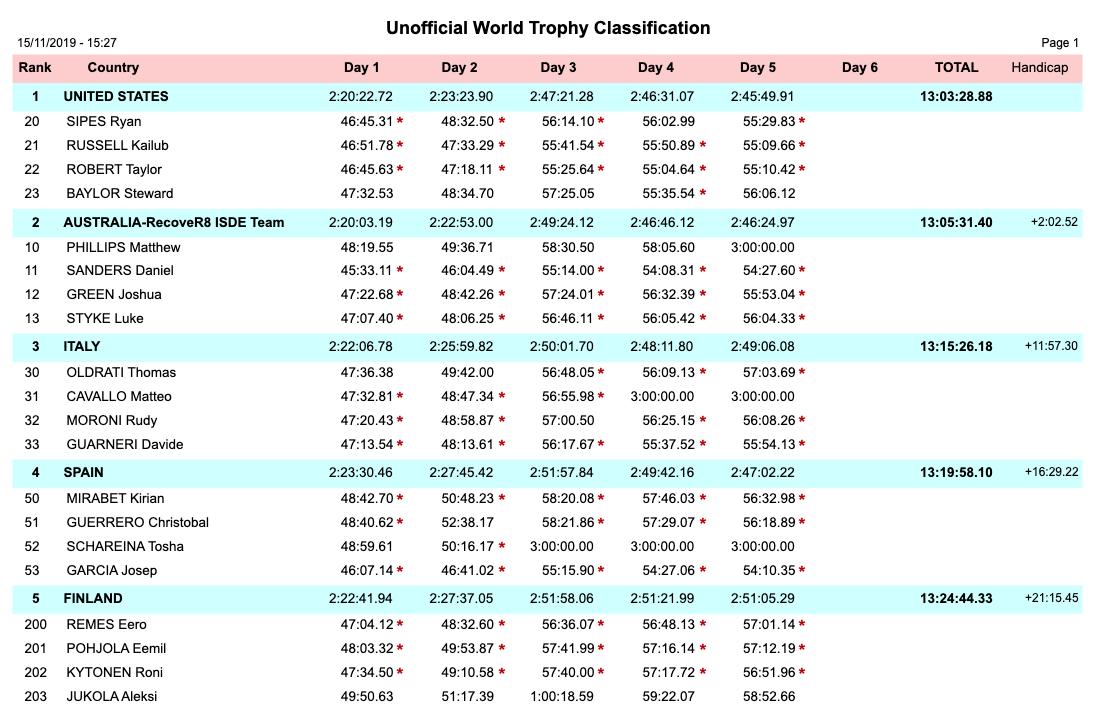 The United States have moved closer to winning this year’s FIM World Trophy category at the FIM International Six Days of Enduro (ISDE) with victory on the penultimate day of competition. Also taking a firm grasp of the FIM Women’s World Trophy class, the United States lead with just one day remaining. RecoveR8 Team Australia shoot for gold in the FIM Junior World Trophy category as defending champions Italy drop out of podium contention.