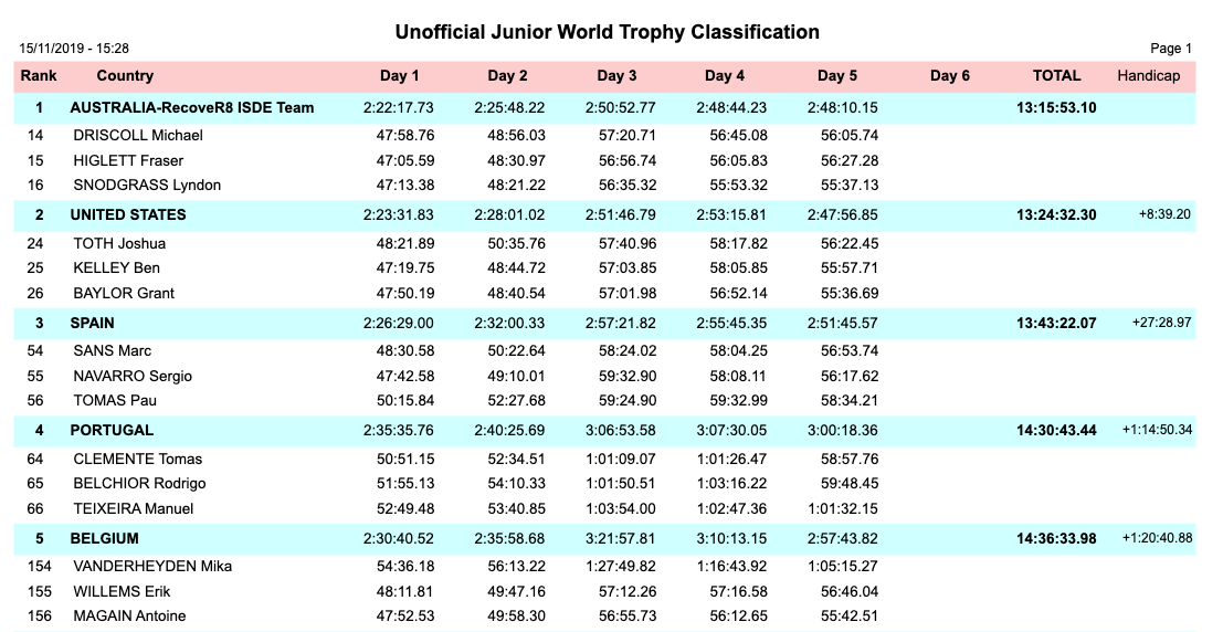 United States were fastest today, but not by enough to properly trouble the Australian’s ahead of tomorrow’s motocross races. Spain, third quickest on day five, are comfortably set in third. Barring any unforeseen circumstances, they should deny host nation Portugal—in fourth—the chance to finish on the podium. Fifth overall, Belgium look to claim one of their best results in recent memory—if they can keep Chile at bay.