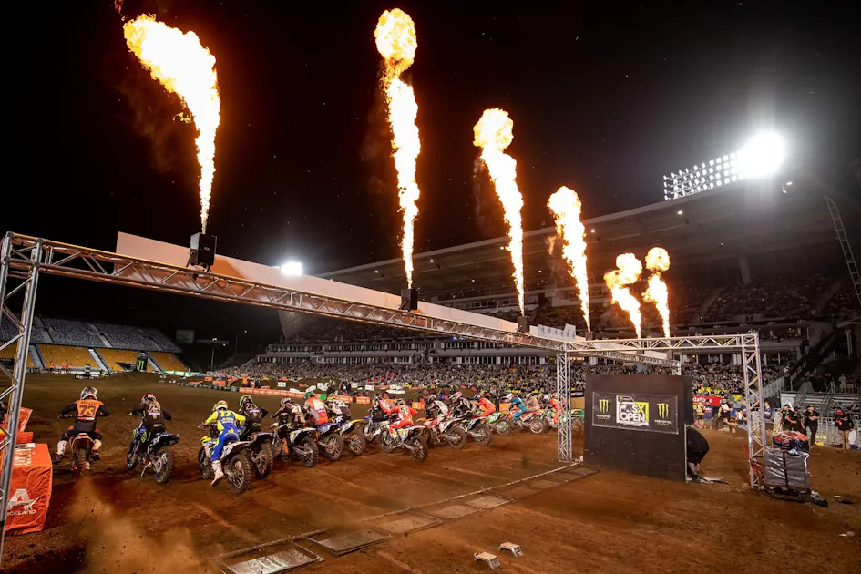 Off-season supercross races always feature jam-packed evenings with plenty of gate drops and action for the fans, but all those fans really want is great racing. This year’s Monster Energy S-X Open in Auckland, New Zealand got the job done. The event featured three main events in each class, a superpole laptime competition, a shortcut lane, freestyle comps, NZ celebrity race and even an ANZAC (Australia and New Zealand) versus Team USA showdown. That schedule alone promised an exciting evening, but what really mattered was the racing, and that ended up being a true highlight. Every single race was close!