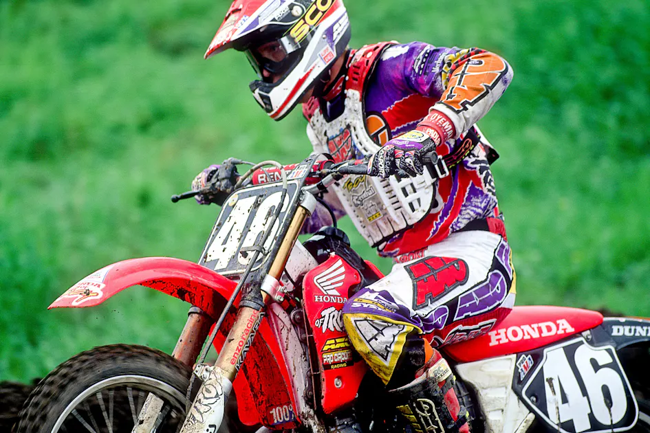 And that’s where his window to make it as a professional began to shut. He struggled to keep that Suzuki up with the satellite factory teams, then suffered a broken back with a huge crash while training in California. That caused him to miss the entire 1997 season and all of SX in ’98. When he finally came back, it was on a privateer 250, and he never made the top ten again.