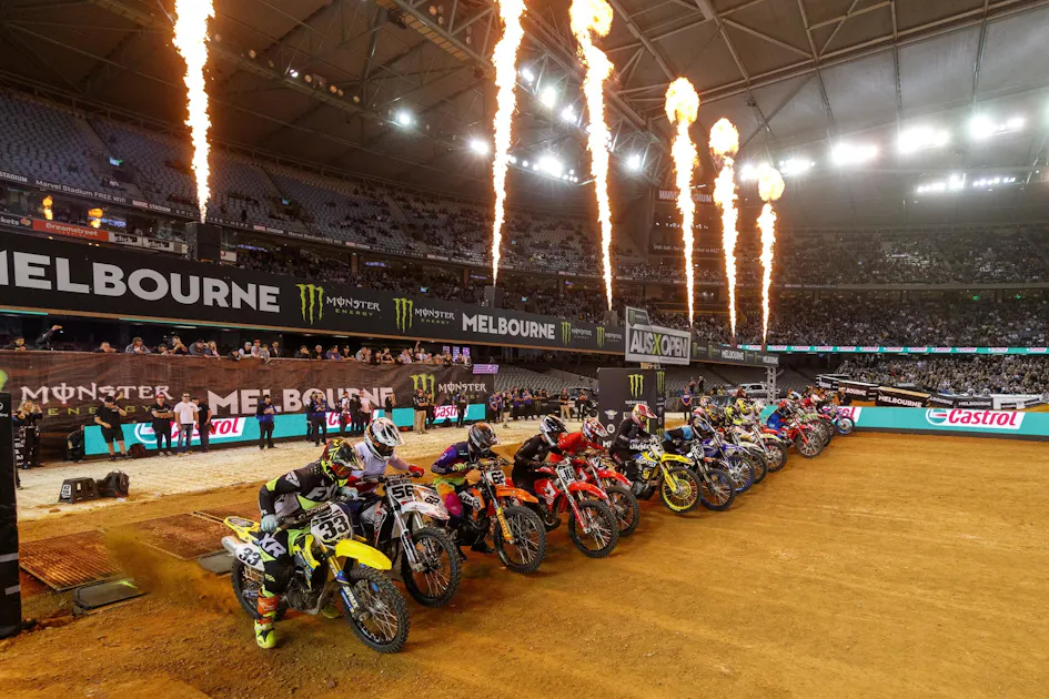 AUS-X Open was well-received in its first few years, but those first events all built into this, a move from a small building in Sydney to a big one in Melbourne. The goal was to draw 35,000 fans, which seemed like a magical number when you heard any Australian state it. That’s a normal U.S. supercross crowd, but even to someone like Reed, a race of this scale in Australia is a life-long dream. Doing something for the first time is not easy. From all the stories I heard, the folks at AME Management (who produce this event, and yes, paid me to come over as part of the TV broadcast, full disclosure) had to jump through major hoops to make this event happen. In the U.S., we have decades of proof that big motorsports events can operate safely inside big domed sports stadiums. It’s still new Down Under, and so there were quite a few weird restrictions in place. For example, the stadium is built with a parking garage underneath the floor, so the AME had to place 1,700 (!) floor jacks under the stadium floor to insure it wouldn’t collapse under the weight of the dirt. This also meant a bull dozer couldn’t drive onto the floor, which complicated track prep. Also, in the pits, bikes could only be fueled in a designated fuel area, and one person had to poor gas, and another had to stand next to that person holding a fire extinguisher. On it went. Lots of restrictions and elements to deal with.