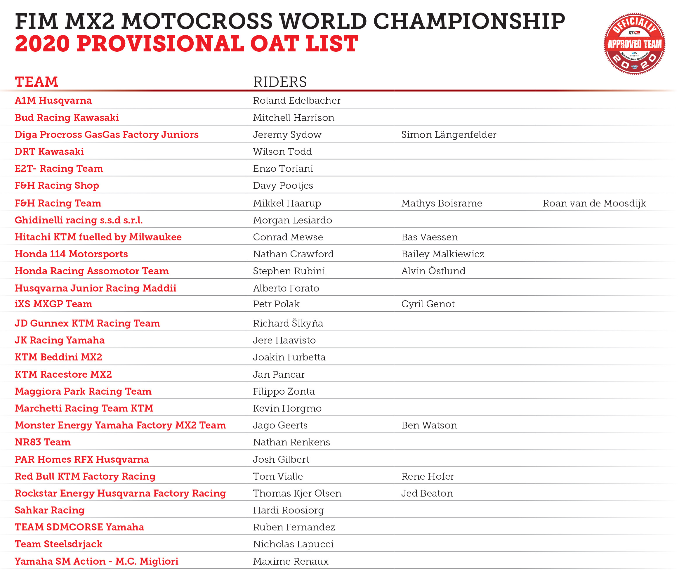 Below is the provisional OAT teams and riders in MXGP and MX2 for 2020.