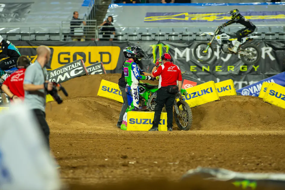 Today’s example is Adam Cianciarulo, who suffered a brutal get off in the whoops in the final race. This was worst-case scenario, with Adam not only flipping over the bars, but then slamming into the face of the next whoop (landing on the face or landing of the next obstacle is usually the biggest factor in a supercross crash. Alex Martin suffered a hellacious flip in the whoops last week but landed on the downside, and was able to pop up without injury).