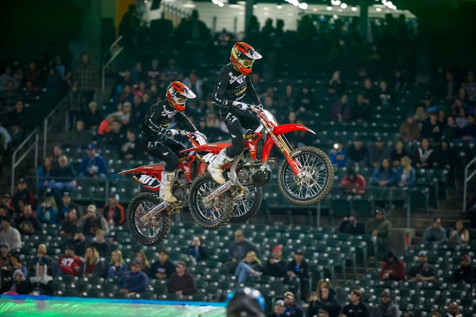 Without GEICO Honda having riders behind the gate (both Christian Craig and Jett Lawrence are out with injuries), Luke Clout and Mitchell Oldenburg got things going quickly at the Oakland Supercross Saturday. The Penrite Honda teammates ran at the front of the second 250SX heat race as Oldenburg led Clout through the first lap, and the two traded spots with one another several times throughout the seven-lap race. Eventually Monster Energy/Pro Circuit Kawasaki’s Cameron McAdoo overtook both riders for the lead before taking the checkered flag. Oldenburg and Clout finished third and fourth, respectively, cementing their way into the main event.