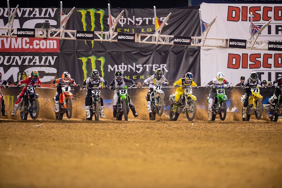 The start for San Diego made me immediately take a deep breath and whisper “here we go.” While nothing is certain, I absolutely believe that this type of start is the most likely to cause first turn crashes. They may not be violent crashes (see: good) but the short straight and flat 90-degree corner both contribute to incidents. The short length doesn’t give riders room to separate, often resulting in locked handlebars as riders are hoping to brake and turn. Those locked bars cause riders to continue on going straight and unable to slow down. That in turn forces riders deeper into the turn and more likely to push through the flat 90-degree left. When riders push off the track, they encounter plywood and all sorts of surfaces they would like to avoid. Even if we avoid any sort of crash all night, I have seen too many riders blow off the track and crash with this start variation. I love the big, wide 180-degree first turns that have become the norm. Baseball stadiums often contribute to this type of start due to the floor shape but last week proved it’s possible.