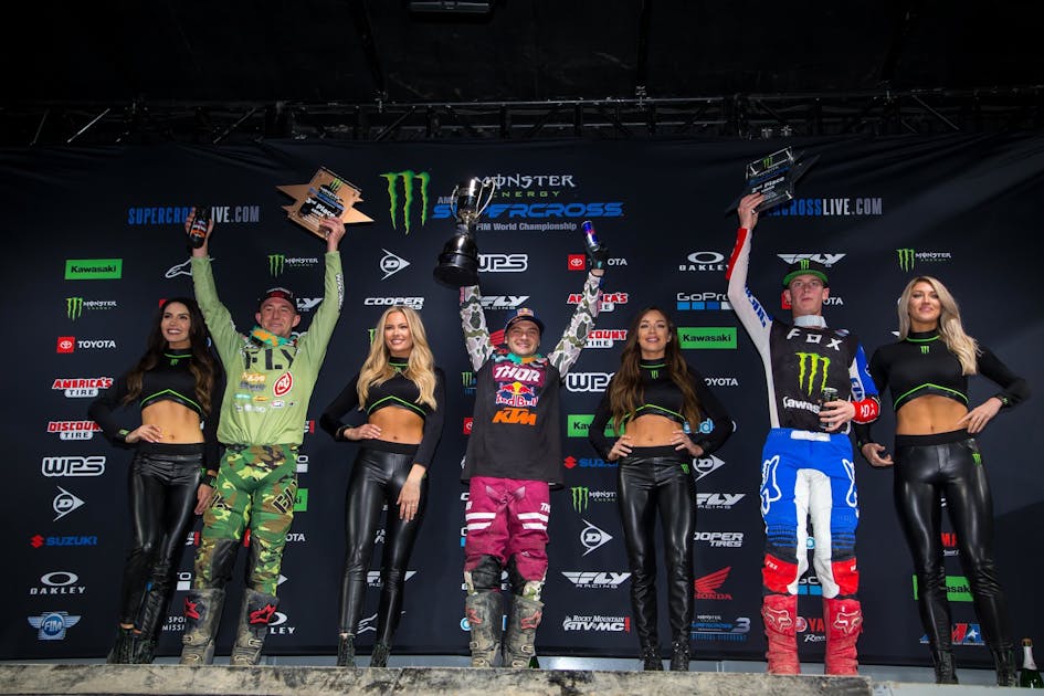 In the 450SX class, it was Cooper Webb who passed Adam Cianciarulo late in the race to pick up his first victory of the season. Cianciarulo was able to hang on for second over a hard charging Blake Baggett who kept the lead duo honest for the entire race.