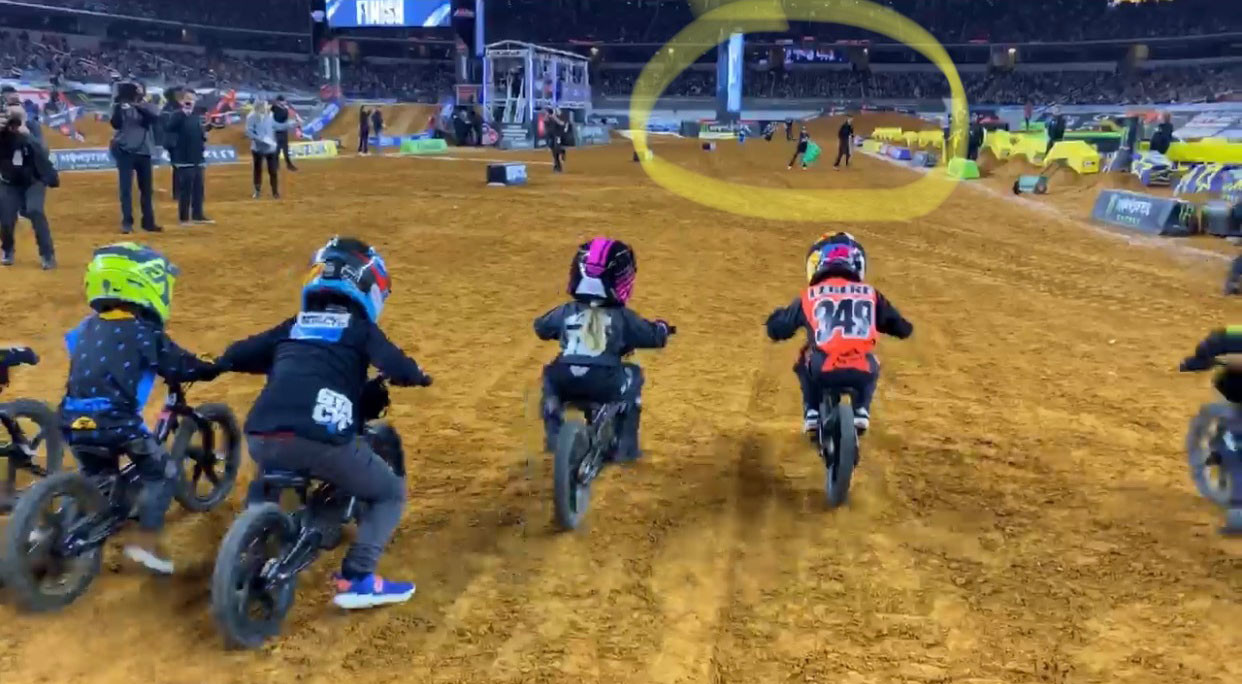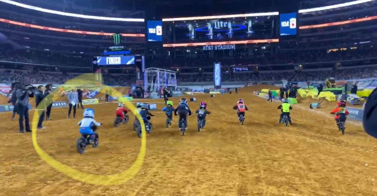 -Before wrapping this up, we had a great discussion on our wrap up pod about Weege’s kid racing the Stacyc race in-between the races at AT&T Stadium. I would just like to submit the photos below here (we obtained some top secret video from a source that shall go nameless but rhymes with “Scmustin Schmayton”) proving that Weege’s claim that there was no flag was false. There was a flag and he and his son missed the mark on this one. Badly at that. Weird because Weege was a flagger back in the day and you would think flagging would be something he had down pat. What a complete disaster for Weigandt and his family, poor kid, he can’t help his genes!