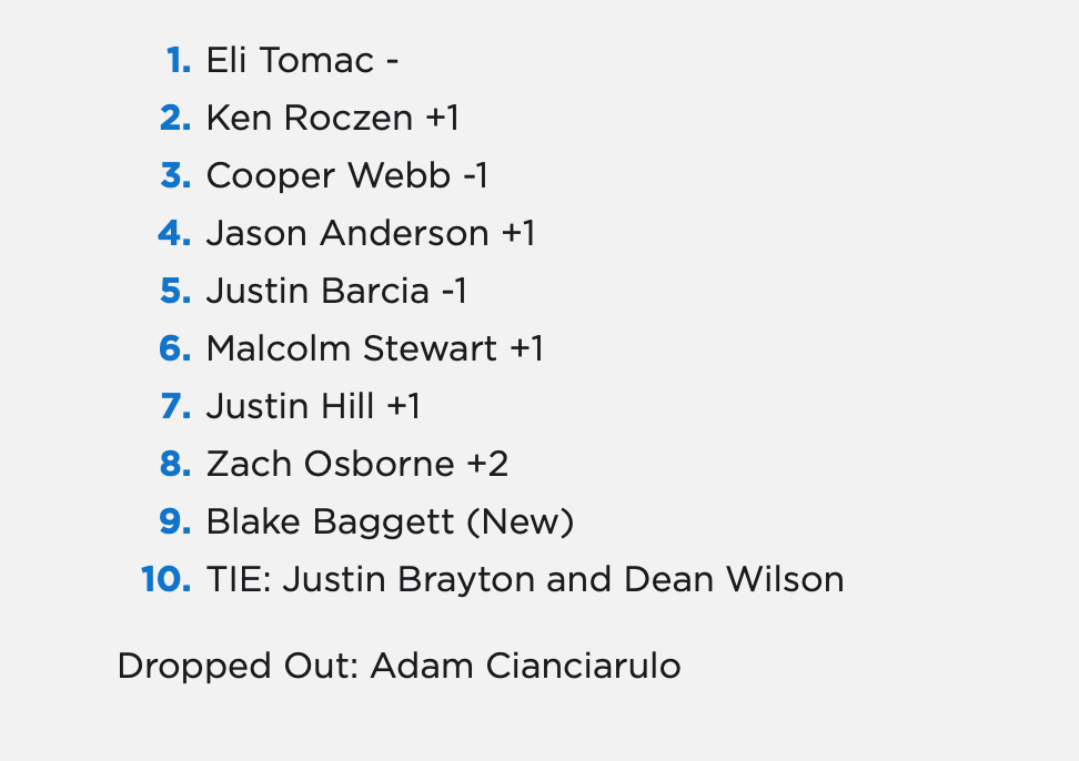 And in case you're keeping up with the Supercross Live Power Rankings, as voted on by a bunch of race-watchers and industry insiders and tabulated by Feld Motor Sports, here's what they look like heading into Week 9:
