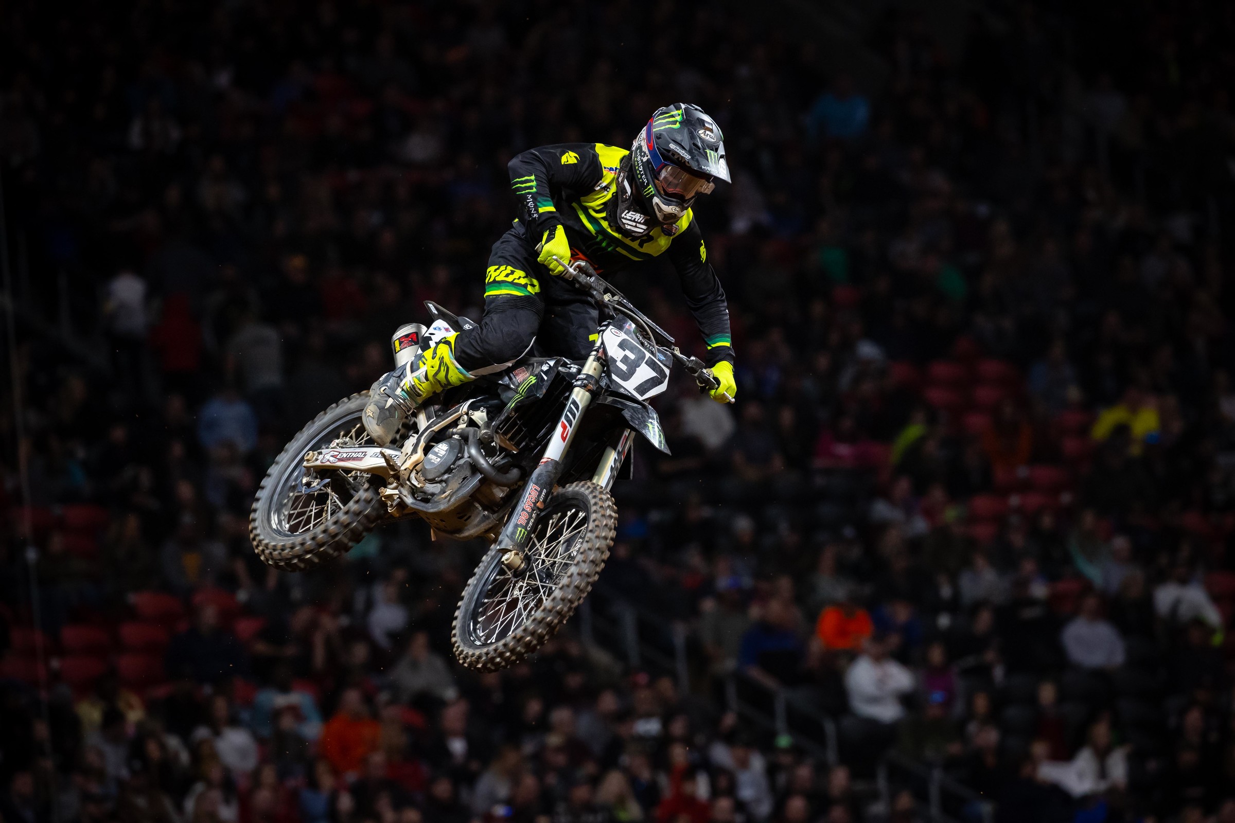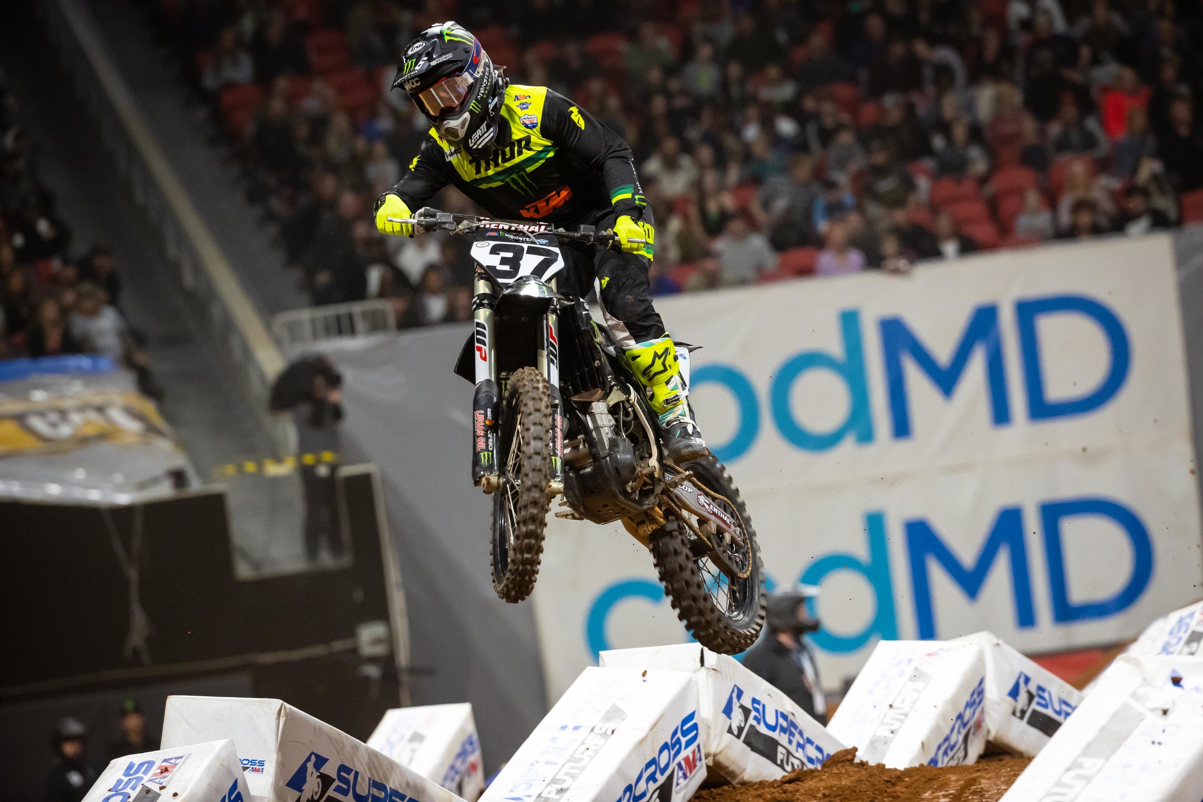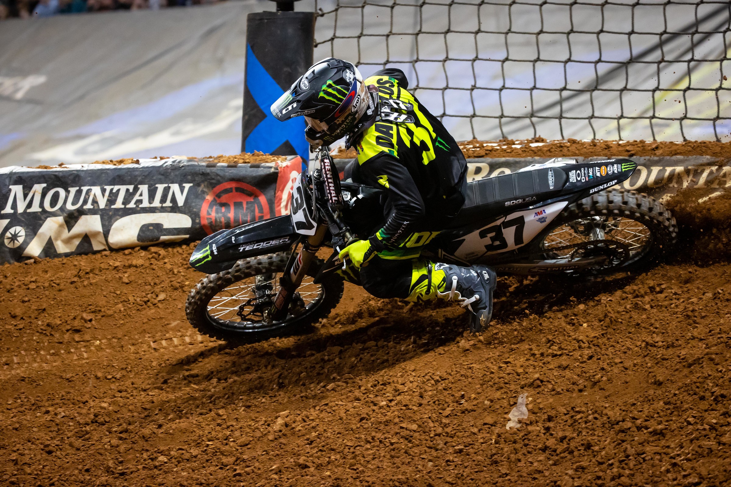 Martin Davalos checked off a lot of boxes Saturday night at the Atlanta supercross. He had his first solid performance in his new 450 supercross career, running second for most of the race. Justin Barcia got him late, but Marty still held a podium spot with a lap to go—the only problem is that Cooper Webb and Eli Tomac were all over him! With a few turns left, a determined Webb and Tomac busted the door down and pushed Marty back to fifth. That made it a great ride and a great night, but not quite the result he wanted after running top-three on every lap but the last one.