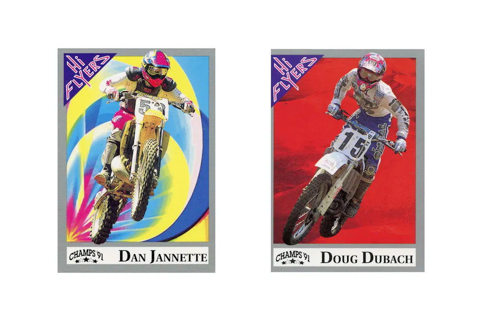 I asked Dan about his card: “The Hi Flyer cards were a fun addition to racing at that time. There wasn’t any social media and it was a way for us to show people what we did. Nineteen ninety one had the highest points in my pro career starting with a trip to Japan for a supercross race, then a decent finish at Gatorback, and a career best fourth at the muddy Hangtown in the 250 class. Two weeks later I broke my wrist in the St. Pete Supercross. But overall, a fun time traveling around the country in box van’s racing motorcycles.”