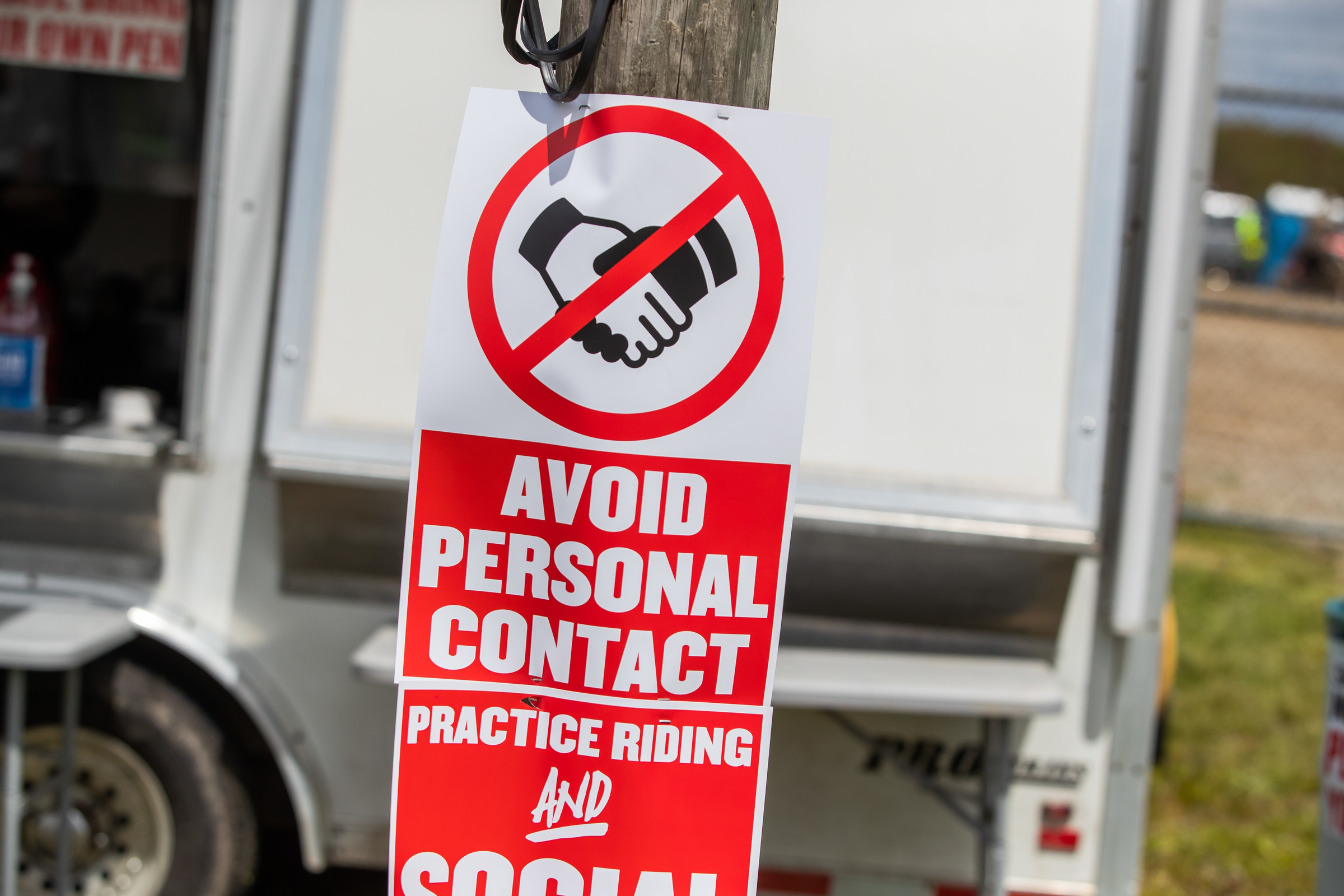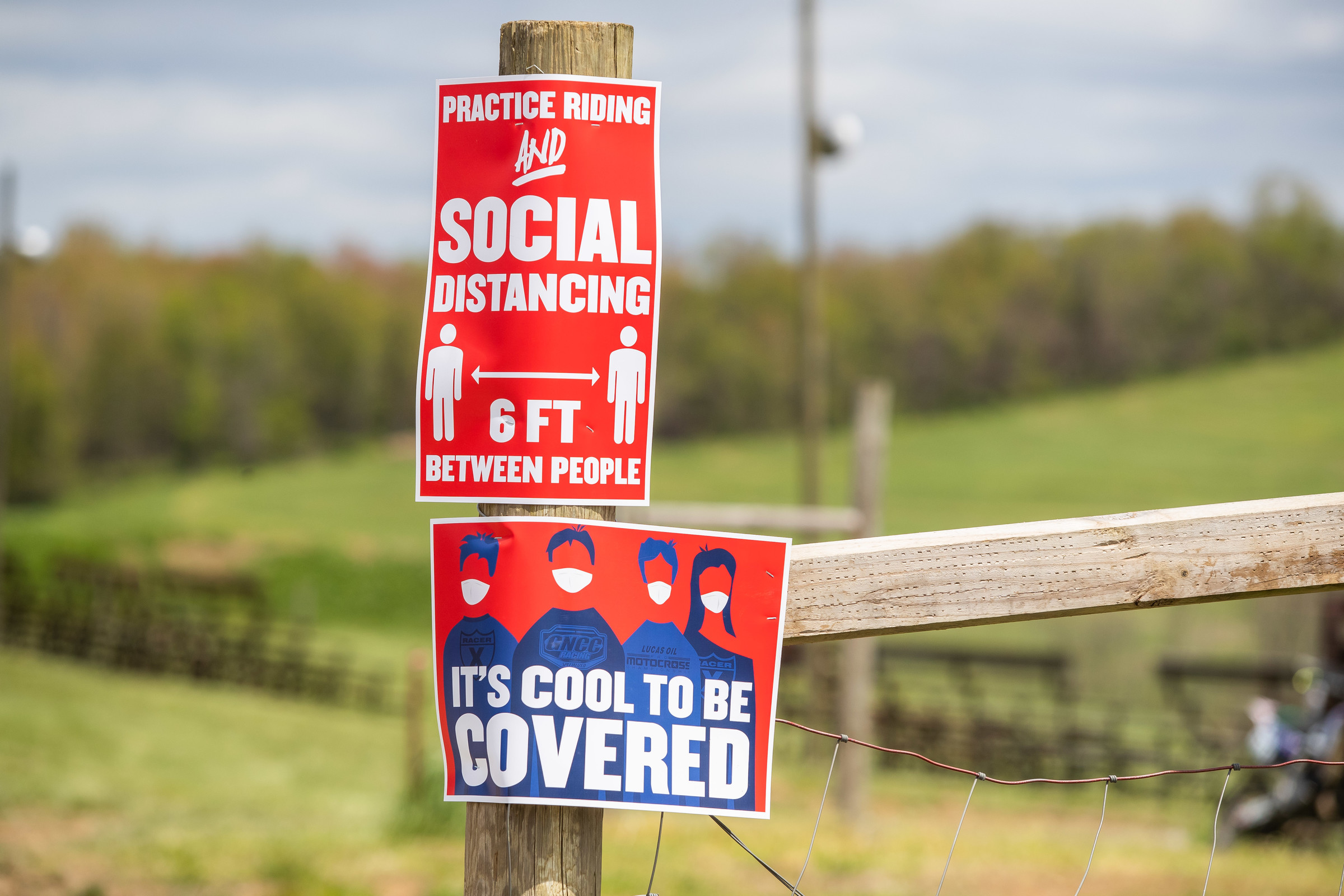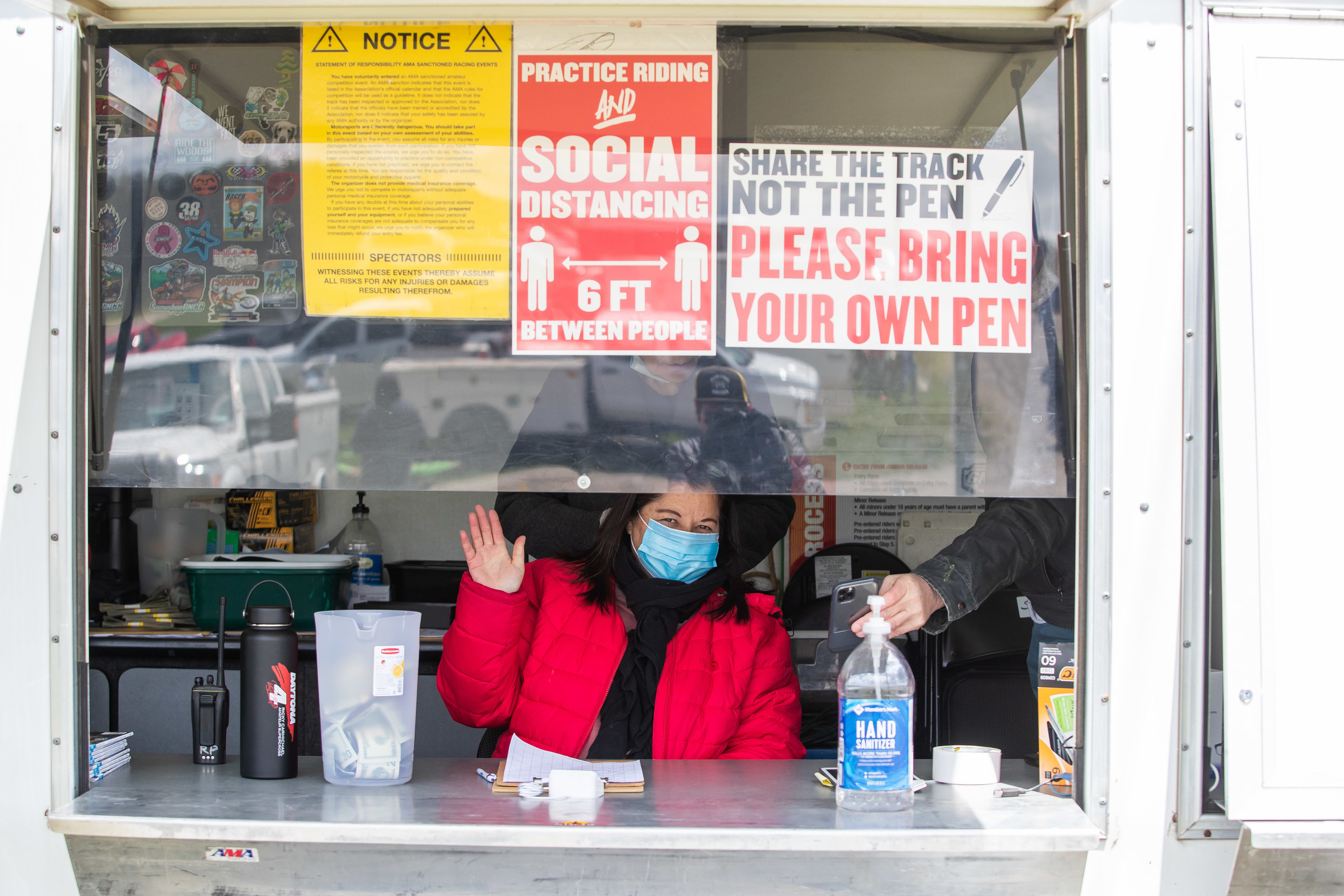 Upon arriving at the track, Carrie Coombs-Russell (CEO of MX Sports Pro Racing, Racer X’s sister company) welcomed us with two handouts—a liability form (which was a one-pager just for each individual to sign, instead of the usual clipboard with multiple signatures from multiple people) and a Safe-To-Race guide that outlined the basic information on the riding areas available to each bike size and rider age and health considerations. After finding a parking spot with ten feet on each side of us, we filled out our paperwork in the truck and took it to the registration station. Although markers were set up to separate people in a long line, there was no line when we made our way over. We simply handed our signed paper to my coworkers and gave them exact change. It was a quick, minimal contact interaction.