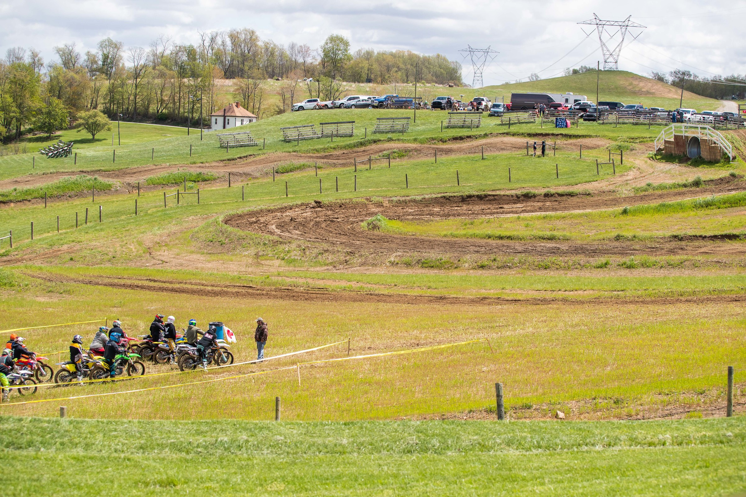 Once I geared up, undid the straps, took my bike off the trailer, and made my way down under the large bridge/walkway and onto the starting straight, all the worries I’d had were gone. I was just here to have fun on my dirt bike. With the grass and slick conditions (it was snowing earlier that morning!) the first lap for each class was a sighting lap—low speeds, low RPMs, and no jumping. After that, it was full throttle. Okay maybe half throttle for me but still!