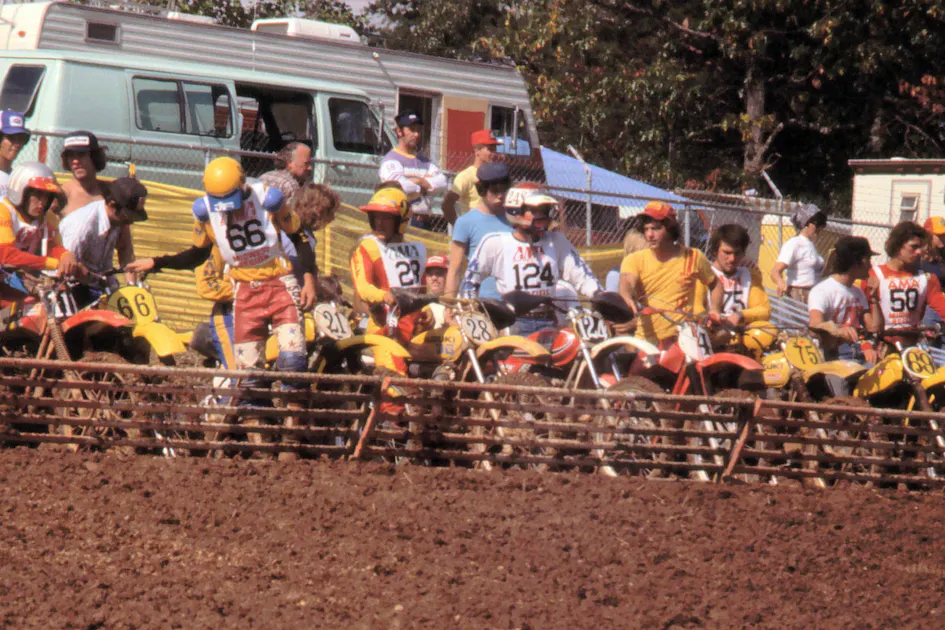 “For the first moto you would draw a number out of the bucket, and I got the last number, so I was the last person to line up at the gate. Well, there wasn’t enough spots on the gate—they didn’t have individual backward falling gate like today, but rather big metal sections that fell forward—so I had to line up beside the far outside of the gate. Just before the start the referee comes over and says, ‘I’m watching you.’ I said, ‘Okay, that’s fine, I won’t be doing anything like that.’ But when I was out there was just past where the tractor reached when it was tilling the start up, so I had some nice tacky ground on the outside where I could get a good drive on. Everybody else was in this tilled-up dirt, I was really fortunate that I got the last gate pick!”