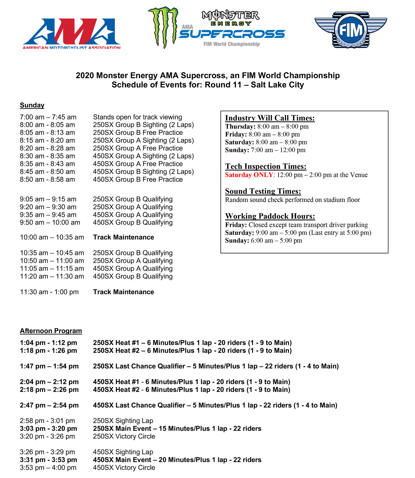 Salt Lake City 1 Supercross Race Day Schedule