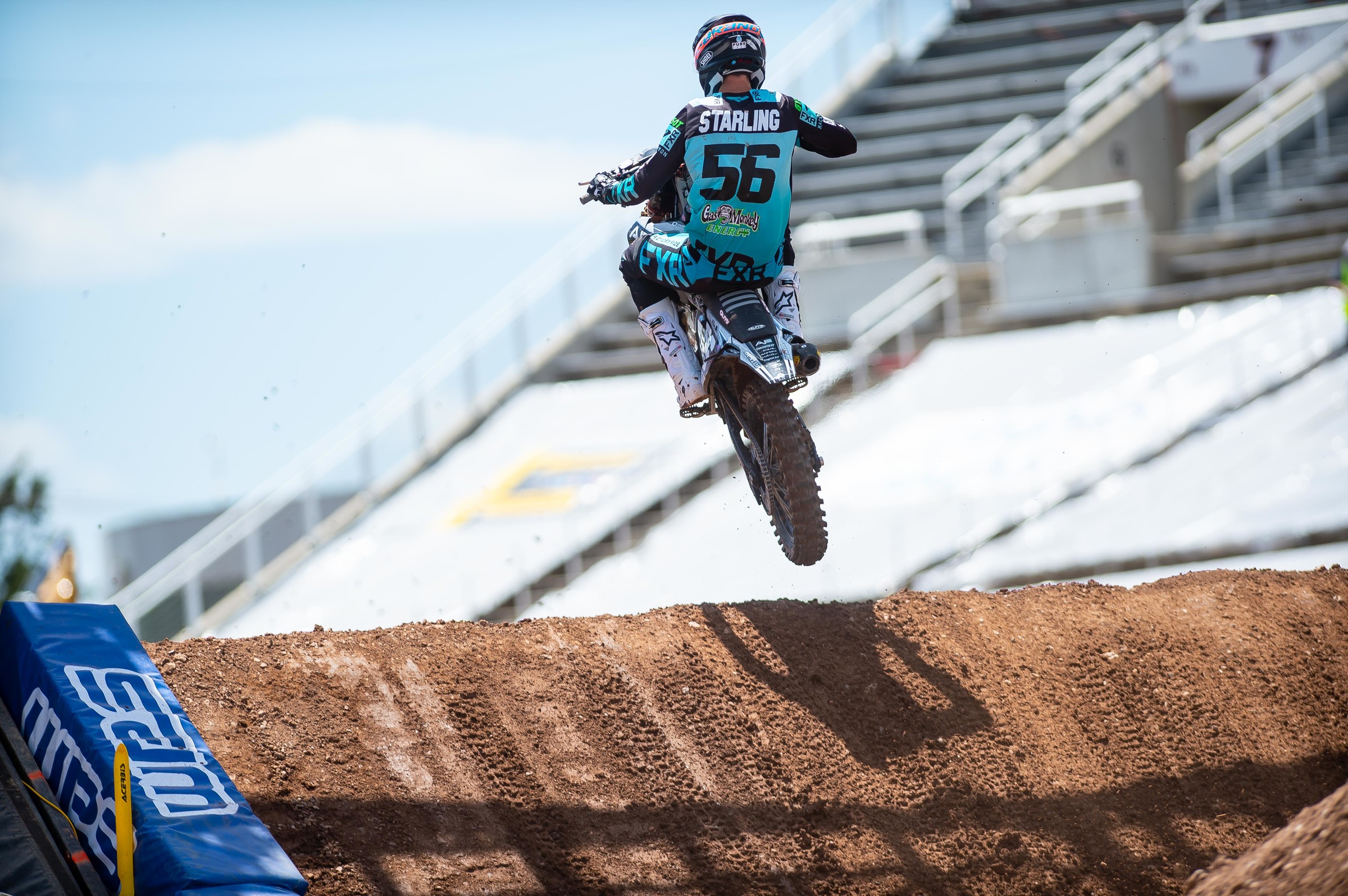 After an early-season foray with Michael Lindsay’s new FXR/Chaparral Honda team, Starling has switched back to the squad he rode for in 2019 and 2018, Gas Monkey Energy/AJE Motorsports Husqvarna. His re-debut came Sunday in the 250SX East division, but it was spoiled by boiling fuel, a byproduct of racing with heat and elevation (his bike wasn’t the only one to suffer from that issue on Sunday). Starling was bummed because he says it’s the first time he has ever pulled off in a supercross race.