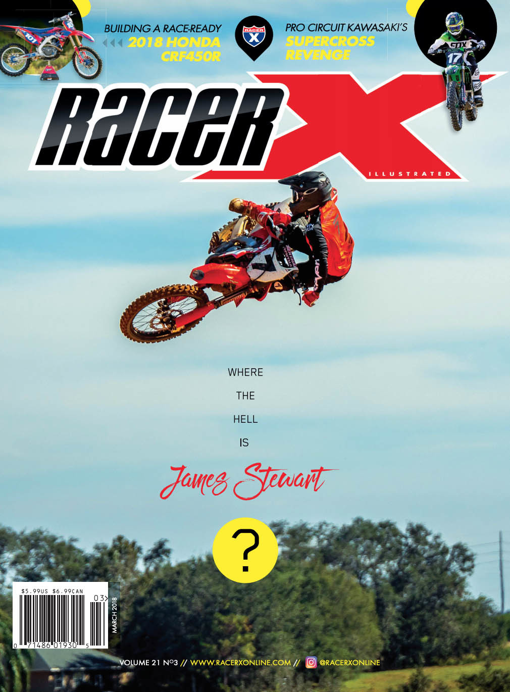 One month later our March 2018 issue featured one of our more unique and difficult cover shots, the elusive James Stewart riding a Honda at his private track in Florida. The cover line asks the question that was on everyone's mind at the time, "Where the Hell is James Stewart?" And the young photographer who got the shot, during Stewart's annual JS7 ride day just before the Mini O's in Florida, was Collin Speckner. We never did get to talk to James for the feature, but he has since been a little more public in his post-racing life since those mysterious days.